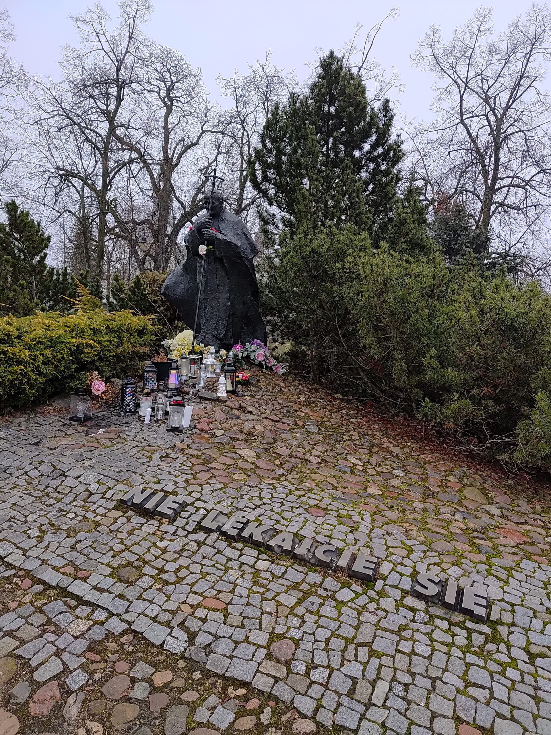 Dopełnieniem zmian, jakie zaszły na miejscu dawnego pomnika Zwycięstwa, Przyjaźni i Braterstwa Broni Narodów Polski i Związku Radzieckiego było postawienie w tym miejscu monumentu poświęconego najsłynniejszemu Polakowi – papieżowi Janowi Pawłowi II. „Papież Pielgrzym”, bo tak ów pomnik się nazywa uznawany jest za dar i hołd złożony przez mieszkańców miasta Wielkiemu Rodakowi. Pomysł uczczenia w taki sposób Ojca Świętego narodził się w trakcie Festiwalu Piosenki Religijnej „Ewangelizacja 2000”, jaki odbył się w Piotrkowie w 1997 roku. Na czele Społecznego Komitetu Budowy Pomnika stanęli ówcześni: poseł na sejm RP Zbigniew Mroziński i radny Władysław Adaszek. Kamień węgielny pod budowę papieskiego pomnika poświęcono i wmurowano w grudniu 1998 roku. Projekt rzeźby przedstawiającej Jana Pawła II schodzącego z gór Podhala, by wprowadzić chrześcijan i świat w trzecie tysiąclecie (stąd nazwa Papież Pielgrzym) powstał pod Łodzią w pracowni rzeźbiarki Krystyny Fałdygi-Solskiej i architekta Bogumiła Solskiego. Odlewy z brązu wykonano w Śremie koło Poznania. Mierząca 2 metry i 20 cm figura Jana Pawła II stanęła w centrum miasta 9 października 1999 roku. Uroczystego odsłonięcia dokonano jednak kilka dni później 16 października, dokładnie w 21. rocznicę pontyfikatu Ojca Świętego. Koszt wzniesienia monumentu wyniósł 60 tys. zł. Miniatura pomnika trafiła również do Watykanu, do samego Jana Pawła II. Kilka tygodni po uroczystościach piotrkowskich do Stolicy Apostolskiej zawieźli ją przedstawiciele lokalnych władz, wśród których nie zabrakło pomysłodawców wzniesienia monumentu. Miejsce pod pomnik nie zostało wybrane przypadkowo. W trakcie ww. festiwalu w 1997 roku w tej części śródmiejskiego parku stał sporych rozmiarów krzyż. Pod pomnikiem odbywają się wszystkie ważniejsze uroczystości religijne. Po śmierci Jana Pawła II w kwietniu 2005 roku tu odbyła się piotrkowska uroczystość pożegnania Ojca Świętego, która zgromadziła kilka tysięcy ludzi. Monument ten jest traktowany przez mieszkańców miasta w sposób szczególny – nigdy nie brakuje pod nim świeżych kwiatów i zapalonych zniczy.