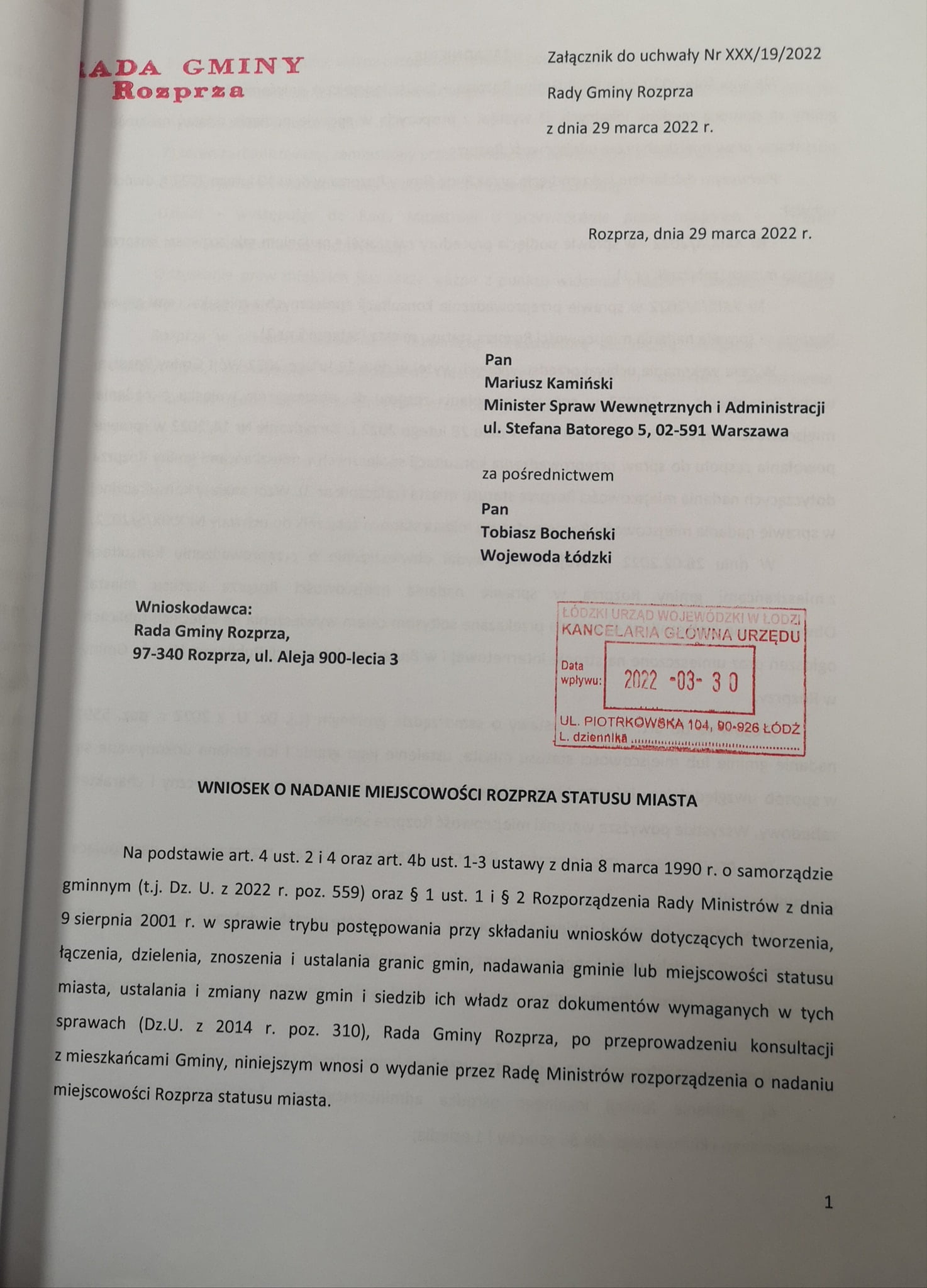 Wniosek o nadanie Rozprzy statusu miasta trafił już do wojewody, a stamtąd do Urzędu Rady Ministrów. Mieszkańcy gminy w konsultacjach społecznych zdecydowali, że „chcą być miastem”, dlatego odpowiednie dokumenty zatwierdziła Rada Gminy, i wniosek trafi niebawem na biurko premiera.