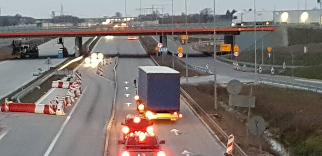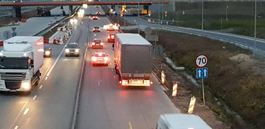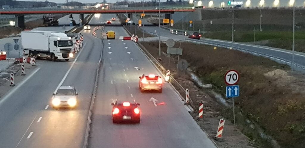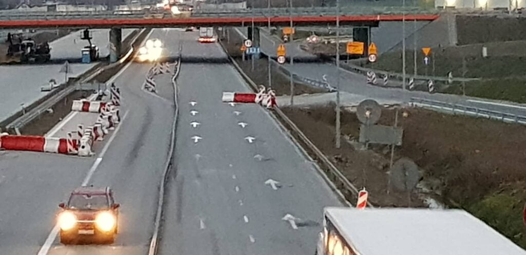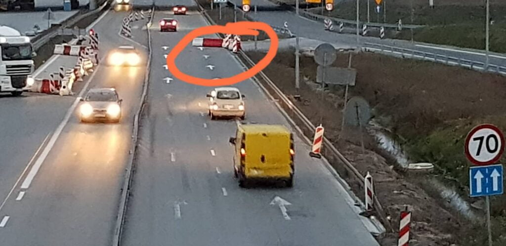 Na zdjęciu widać plastikowe bariery które blokują jeden z pasów w kierunku Katowic, oraz samochody hamujące tuż przed przeszkodą. – Wygląda to jakby następowało zwężenie drogi, a tymczasem znaki pokazują inaczej. W tym miejscu można jechać „siedemdziesiątką”. Zderzenie rozpędzonego pojazdu z taka przeszkodą, może doprowadzić do poważnego wypadku – mówi nasz czytelnik.