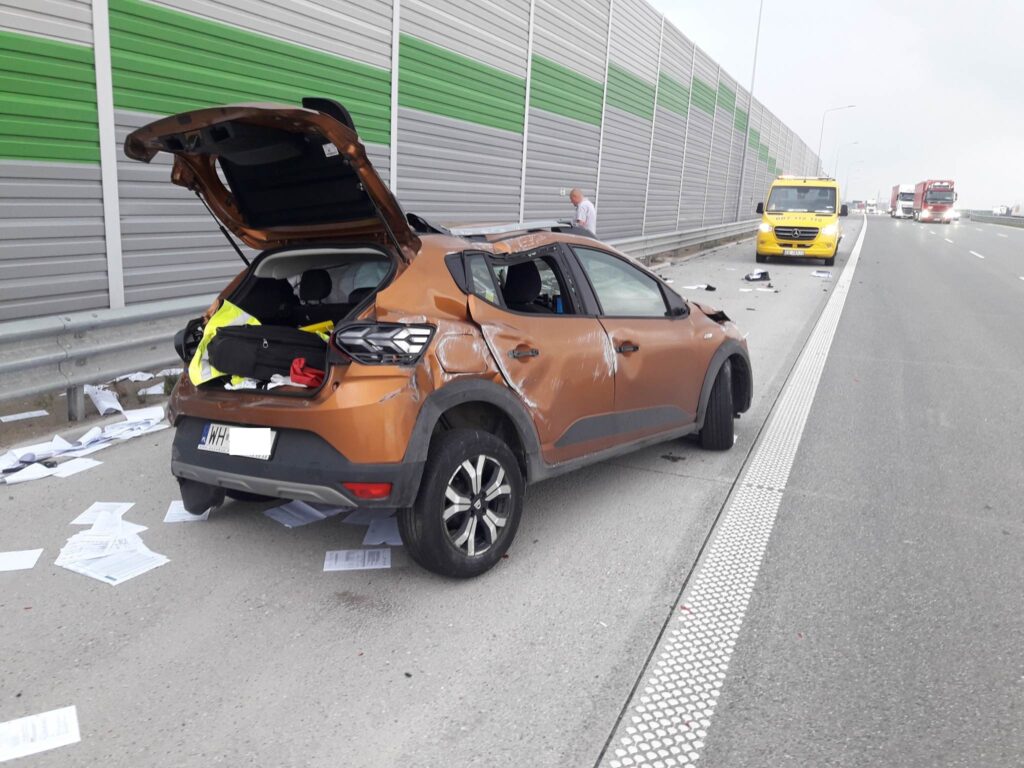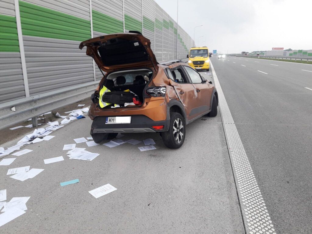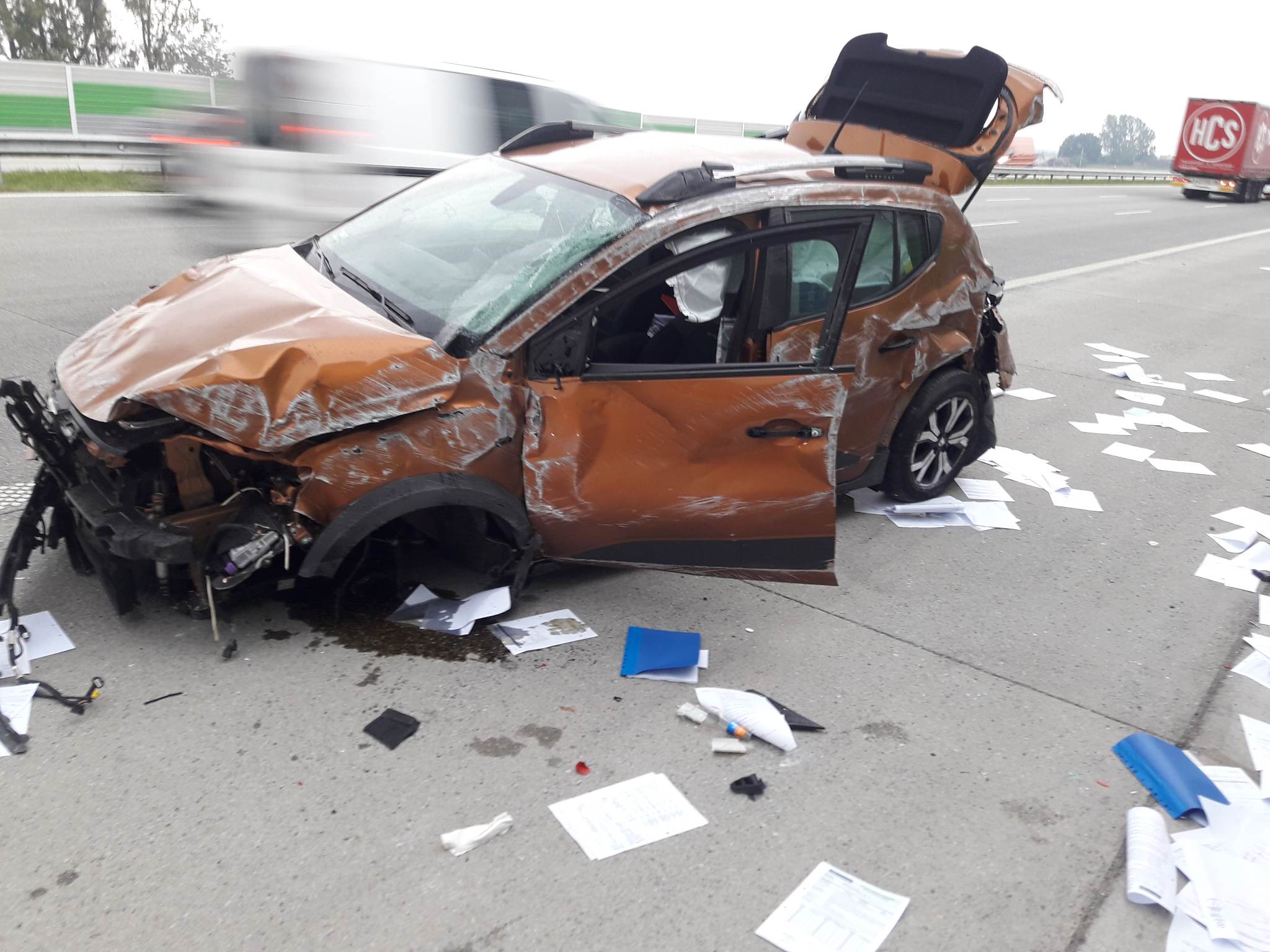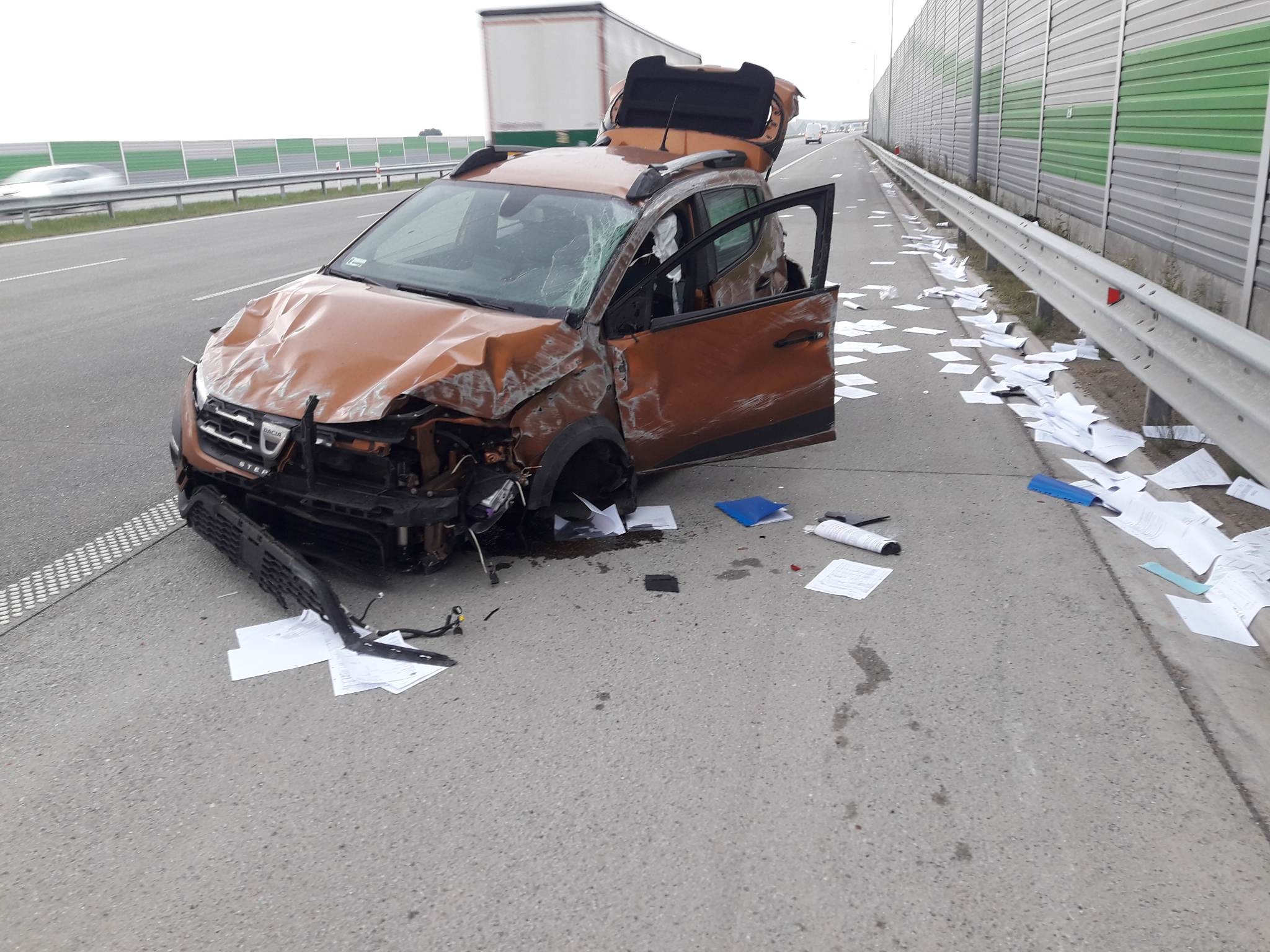 Kierowca samochodu osobowego dacia, z niewyjaśnionych na tę chwile przyczyn, stracił panowanie nad pojazdem, uderzył w bariery a następnie dachował. Do wypadku doszło na autostradzie A1 w kierunku Katowic, na wysokości Woli Rokszyckiej.