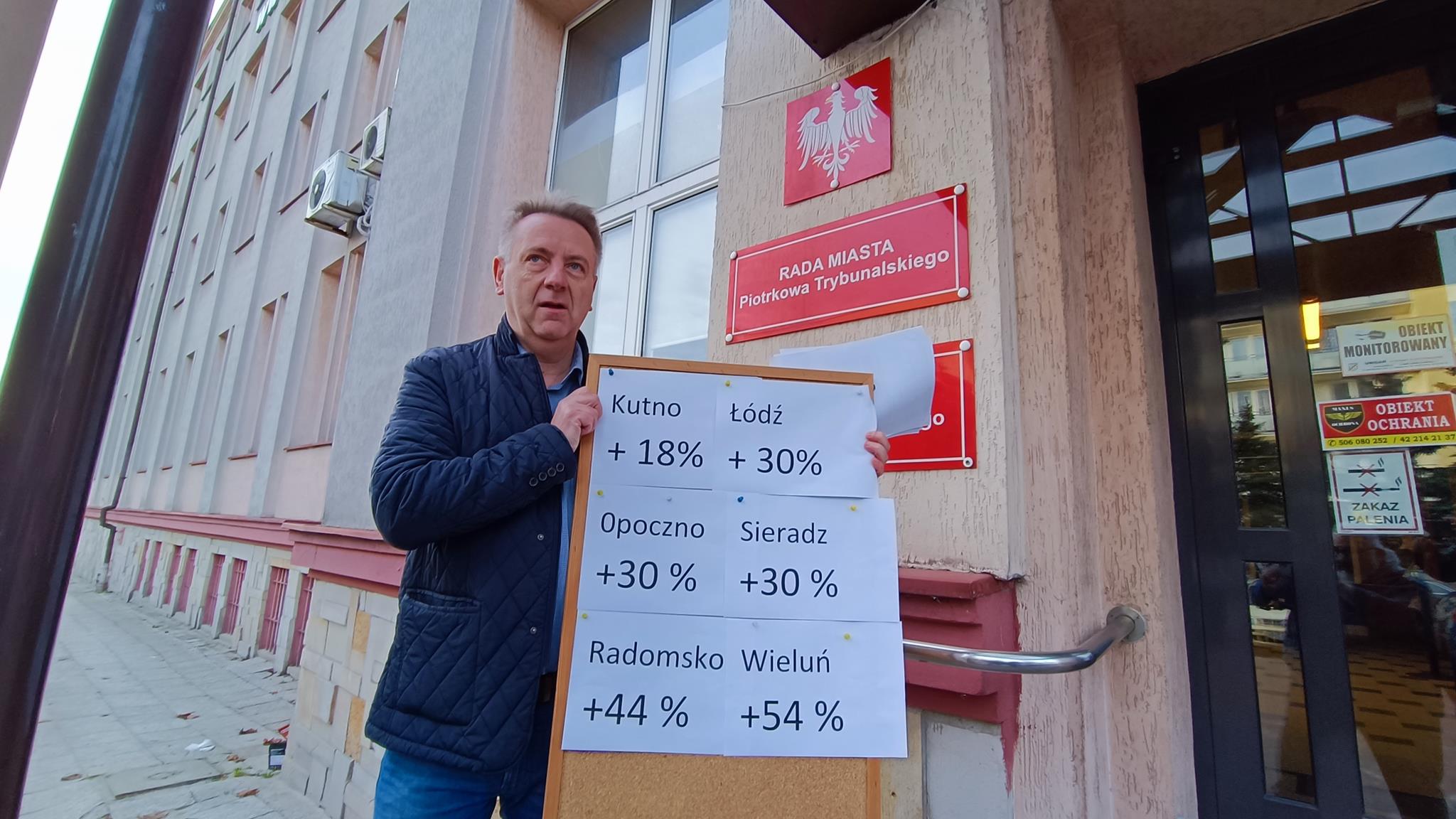 – Uzasadnieniem konieczności ponownego przeliczenia cen za dostawę ciepła są m.in. znacznie niższe podwyżki opłat w innych samorządach naszego regionu. Stowarzyszenie Inicjatywa Piotrkowska 22 zadaje publicznie pytanie prezydentowi miasta: Dlaczego różnica cen jest taka duża porównując Piotrków Trybunalski do innych miast funkcjonujących w tym samym województwie, z czego to wynika? – dopytywał podczas wtorkowego spotkania z dziennikarzami Jacek Sokalski, jeden z liderów stowarzyszenia. – Z informacji uzyskanych telefonicznie udało się ustalić, że podwyżki cen w (przybliżeniu) w innych samorządach naszego regionu wynosiły odpowiednio: w Sieradzu o 30%, Opocznie o 30%, Bełchatowie 30%, Łodzi 30%, Radomsku 44%, Wieluniu 54%, Kutnie 18,7% a Piotrkowie Trybunalskim blisko 100% – mówił Sokalski.
