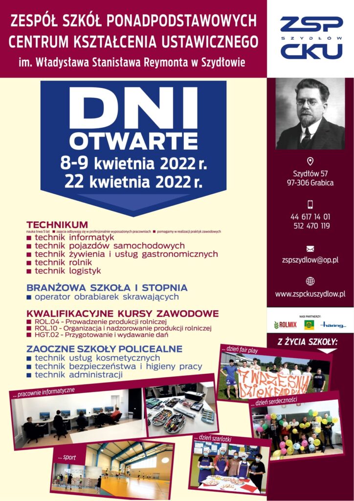 Dyrekcja, grono pedagogiczne oraz uczniowie Zespołu Szkół Ponadpodstawowych Centrum Kształcenia Ustawicznego im. Władysława Stanisława Reymonta w Szydłowie serdecznie zapraszają tegorocznych ósmoklasistów, rodziców i nauczycieli na Dni Otwartych Drzwi, które odbędą się 8 – 9 i 22 kwietnia 2022 roku (piątek, sobota) w godz. 9:00 – 14:00. W programie, m.in.: zwiedzanie szkoły, pokaz gotowania, konkursy sportowe,•wielkanocny „quiz” w języku angielskim, „szybkie” rozgrywki szachowe, konkurs rozpoznawania nasion i obserwacje mikroskopowe, Marshmallow challenge, pokazy strażackie oraz pokazy wymiany opon i budowy silnika. Dla wszystkich odwiedzających – słodki poczęstunek.