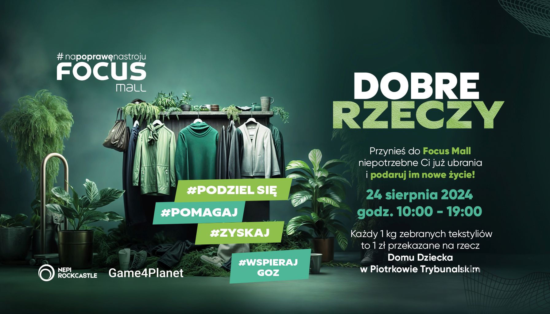 W Polsce rocznie aż 2,5 mln ton wszystkich odpadów stanowią odpady tekstylne. Chociaż połowa z nich nadaje się do odzysku, to tak się nie dzieje. Niepotrzebnym ubraniom można dać szansę na ponowne wykorzystanie. W tym celu Focus Mall w Piotrkowie Trybunalskim we współpracy z Game4Planet organizuje zbiórkę „DOBRE RZECZY”. Celem akcji jest edukacja ekologiczna – traktowania tekstyliów jako cennych surowców, które mogą otrzymać drugie życie, pozostając w obiegu lub posłużyć jako składnik materiałów kompozytowych. Inicjatywa ma także wymiar społeczny – wsparcie Domu Dziecka w Piotrkowie Trybunalskim.