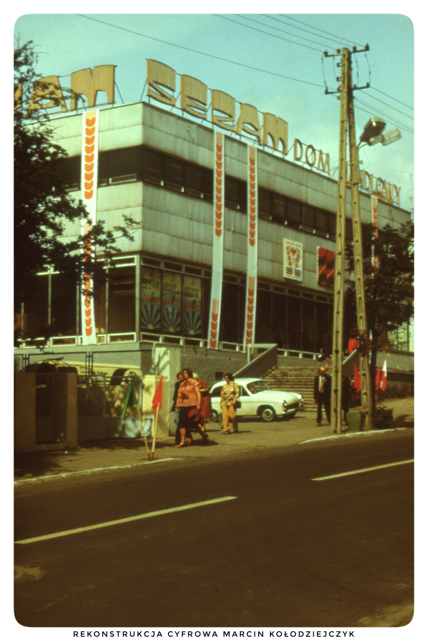 Na posesji, którą pierwotnie wybrano na miejsce lokalizacji D.H. „Sezam” stanął w latach 70. trzypiętrowy, okazały budynek. Dawna siedziba Komitetu Wojewódzkiego PZPR, z racji koloru ścian prześmiewczo nazywana przez niektórych „Białym Domem”. Władze poprzedniego systemu wolały zatrzymać dla siebie i projekt, który oczywiście trochę rozbudowały i posesję. Handlowcom zaś oddano do dyspozycji znacznie skromniejszy przybytek. Nie mniej, jak mówiła prezes Jończyk, usytuowanie sklepu nie budzi zastrzeżeń w PSS „Społem”. „Ta lokalizacja nam odpowiada. Wszyscy się przyzwyczaili, że po prawej stronie ulicy Sienkiewicza jest nasz Sezam, nasze „społemowskie serduszko”. I z tego co wiemy, klienci chcący zrobić zakupy częściej kierują się w prawą stronę, ku naszej placówce.”.