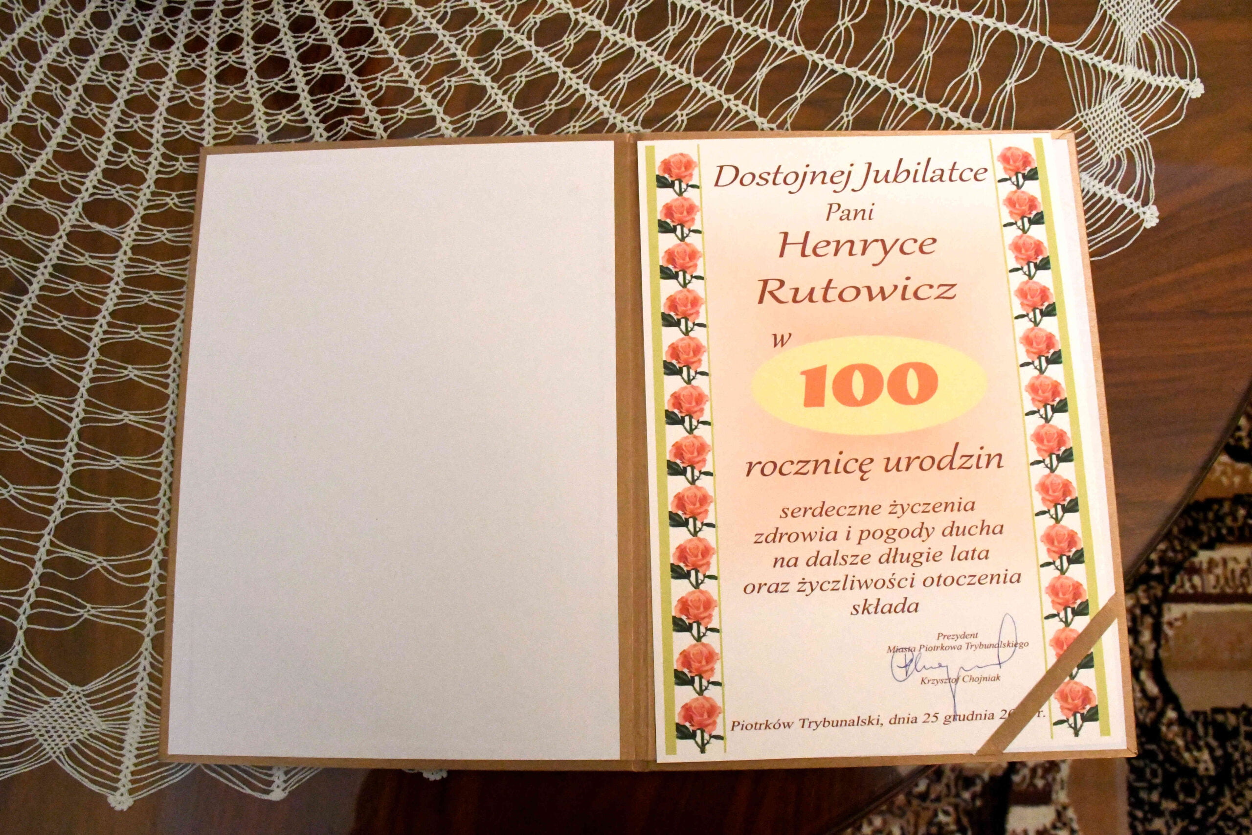 – Życzymy jeszcze wielu lat w zdrowiu i pomyślności, aby pogoda ducha Pani nie opuszczała, a najbliżsi otaczali Panią życzliwością – życzył prezydent. Mimo ukończonych stu lat jubilatka cieszy się dużą siłą i witalnością oraz zdrowiem. Okazało się, że pani Henryka jest czujnym obserwatorem wydarzeń, jakie dzieją się w kraju. Na pytanie o przepis na długie życie najbliżsi jubilatki zdradzili, że żelazną zasadą od wielu lat jest codzienny malutki kieliszek koniaczku.