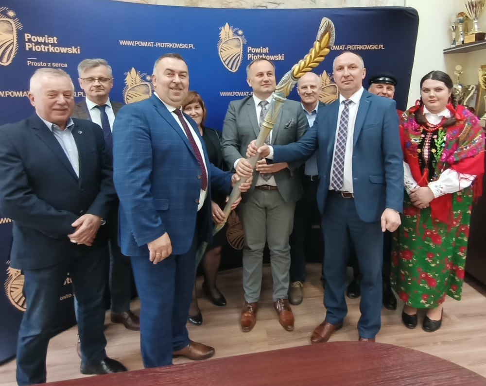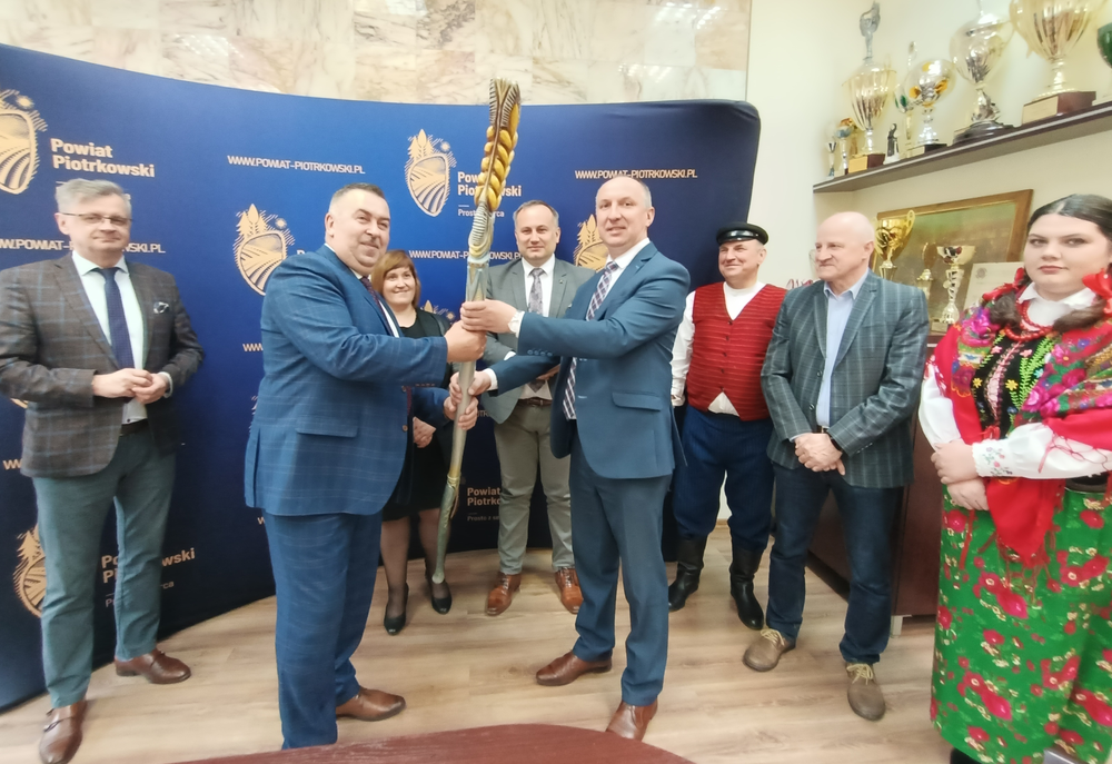 Podczas spotkania starosta Piotr Wojtysiak wraz z Przewodniczącym Rady Powiatu Bernardem Matyszewskim i wicestarostą Dariuszem Magaczem, podziękował dwukrotnym gospodarzom dożynek – wójtowi z Czarnocina Romanowi Miksie za pomoc w organizacji powiatowego święta plonów, w tak trudnym czasie, jakim była pandemia. Symboliczny kłos został przekazany tegorocznym współorganizatorom, czyli gminie Łęki Szlacheckie, reprezentowanej przez wójta Piotra Łącznego oraz Przewodniczącą Rady Gminy Agnieszkę Łysoń.