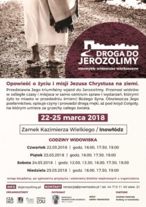 Droga do Jerozolimy to godzinne, plenerowe, interaktywne widowisko wielkanocne przedstawiające najważniejsze wydarzenia poprzedzające śmierć Jezusa Chrystusa. Rozgrywa się w pięknej scenerii ruin Zamku Kazimierza Wielkiego w Inowłodzu. Wjazd i brama prowadząca na dziedziniec zamku, monumentalne mury i podziemia stają się na czas tej niezwyklej inscenizacji nowotestamentową Jerozolimą, której mieszkańcy entuzjastycznie witają swego wybawcę i króla.
