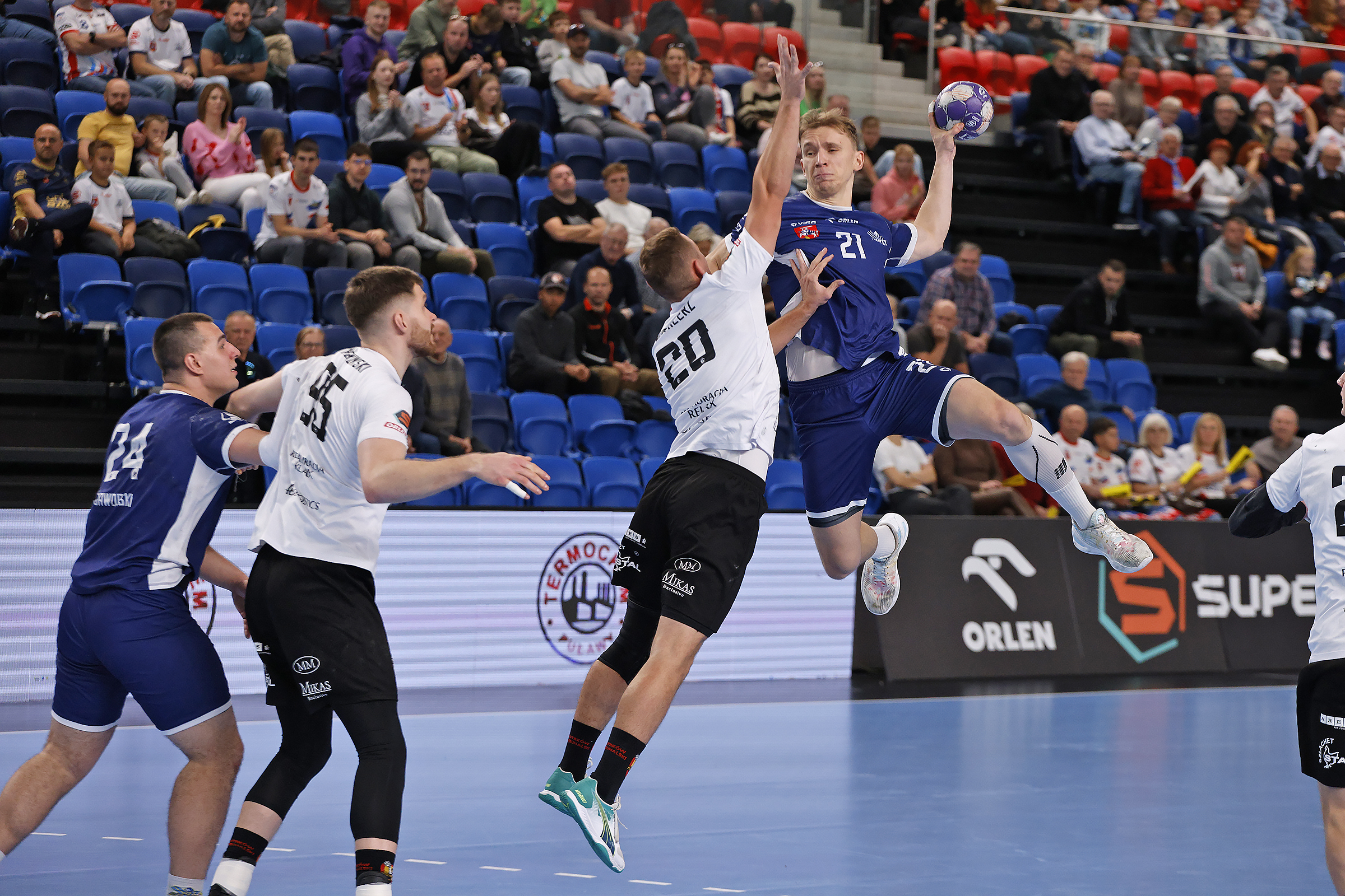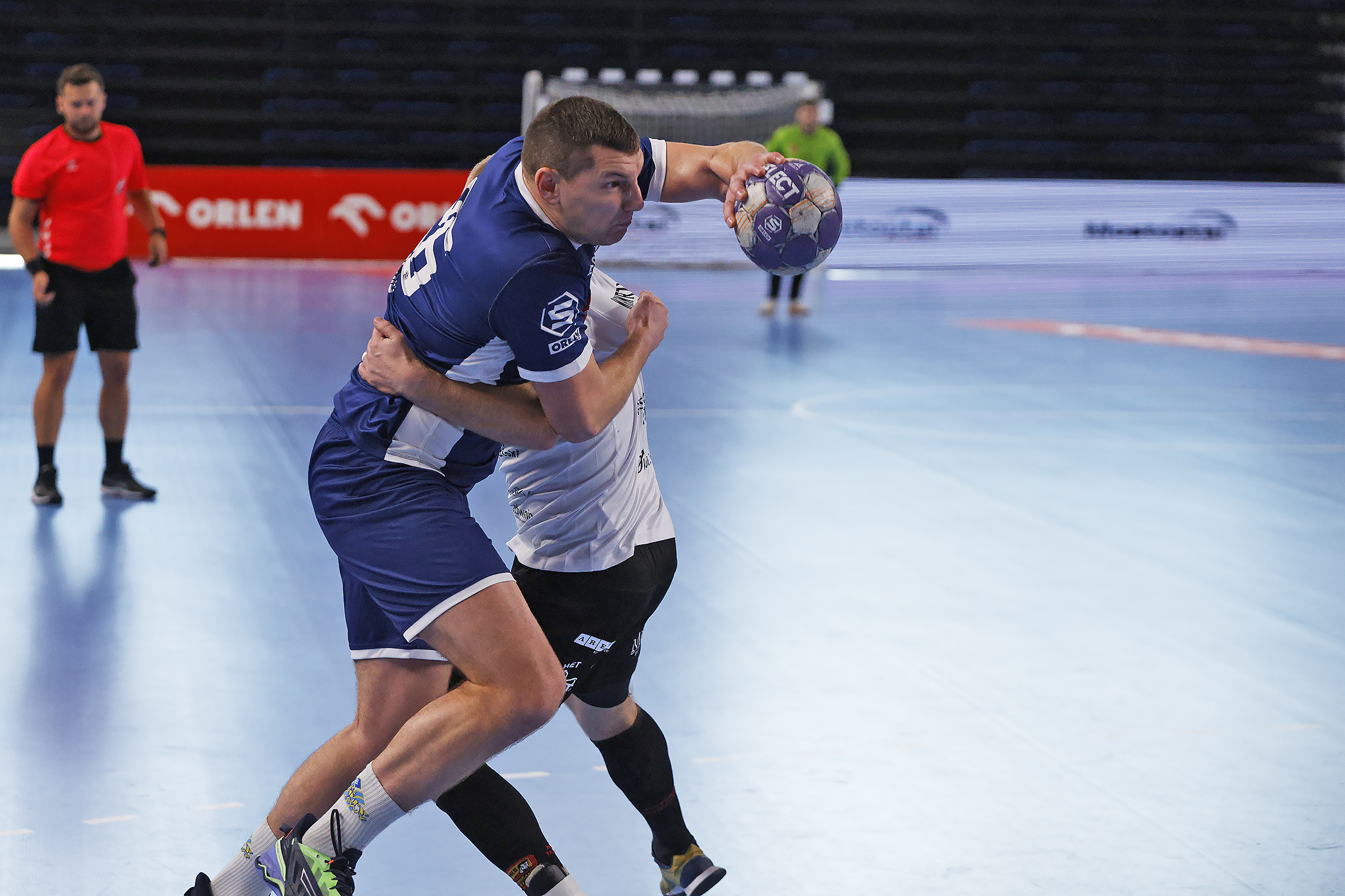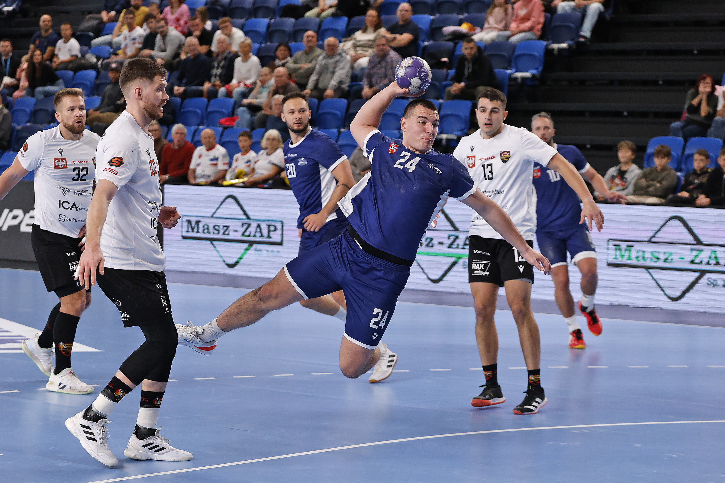 Pierwsza połowa miała dwa oblicza. Początek zdecydowanie należał do miejscowych, którzy w 5. minucie prowadzili już trzema bramkami (5:2). Nic w tym momencie nie wskazywało, że gospodarze mogą mieć dziś problem z odniesieniem zwycięstwa. Ale po bardzo udanym początku w grze miejscowych pojawiły się błędy techniczne w ataku, co skrzętnie wykorzystali rywale. W 12. minucie po dwóch z rzędu trafieniach Rutkowskiego na tablicy wyników widniał remis po 8. Kiedy w 15. minucie Jarosiewicz znów wyprowadził Azoty na dwubramkowe prowadzenie wydawało się, że podopieczni Patryka Kuchczyńskiego opanowali sytuację. Niestety kolejne błędy i nieskuteczna gra w ofensywie sprawiły, że w 19. minucie goście wyszli pierwszy raz na prowadzenie (11:12). Ostatnie 10 minut to nerwowa gra miejscowych i sukcesywne budowanie przewagi przez gości, którzy pierwszą połowę zakończyli trzybramkowym prowadzeniem.