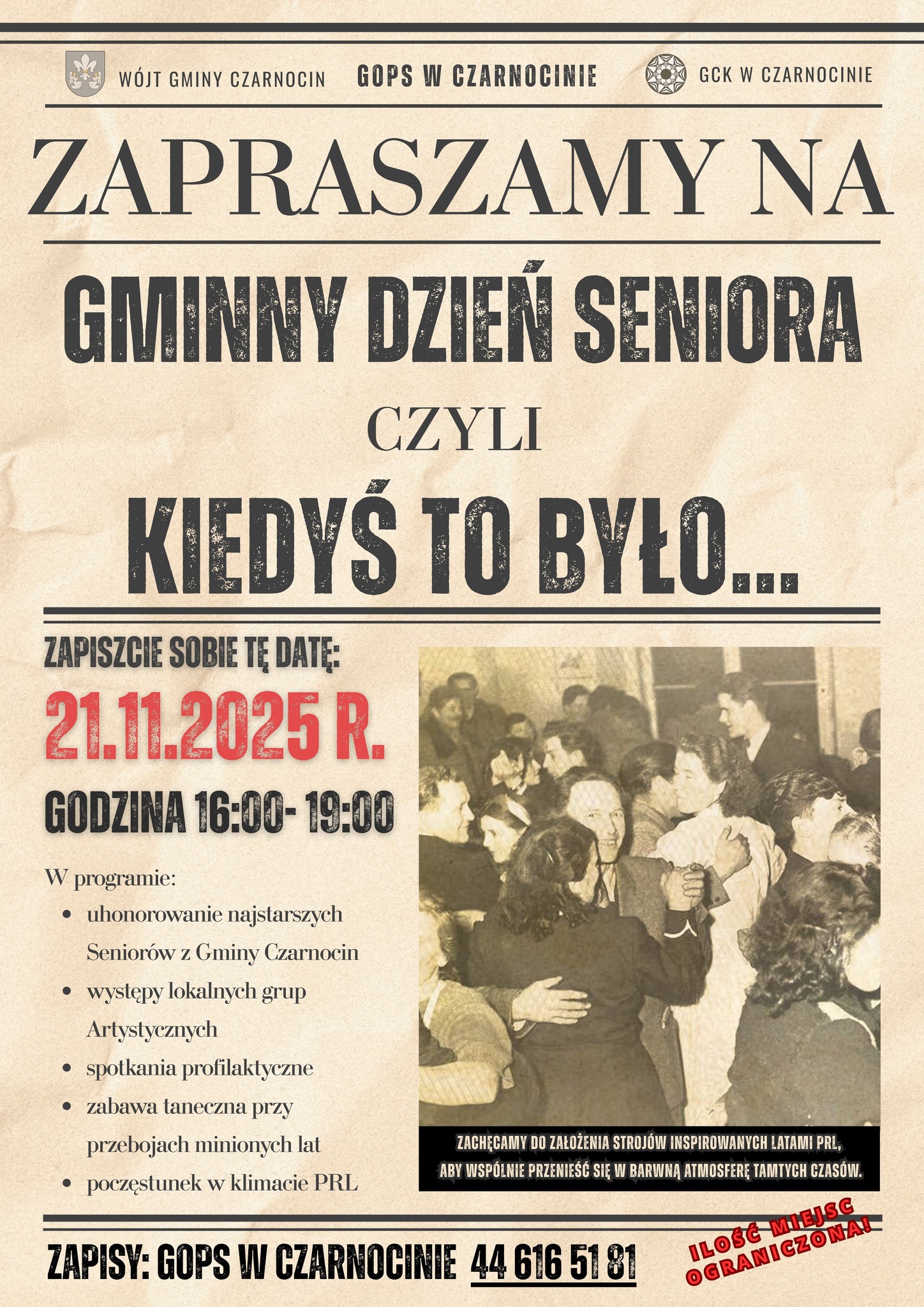Z okazji Dnia Seniora, Gmina Czarnocin zaprasza wszystkich seniorów i seniorki na uroczyste spotkanie w klimacie słusznie minionych lat PRL-u!