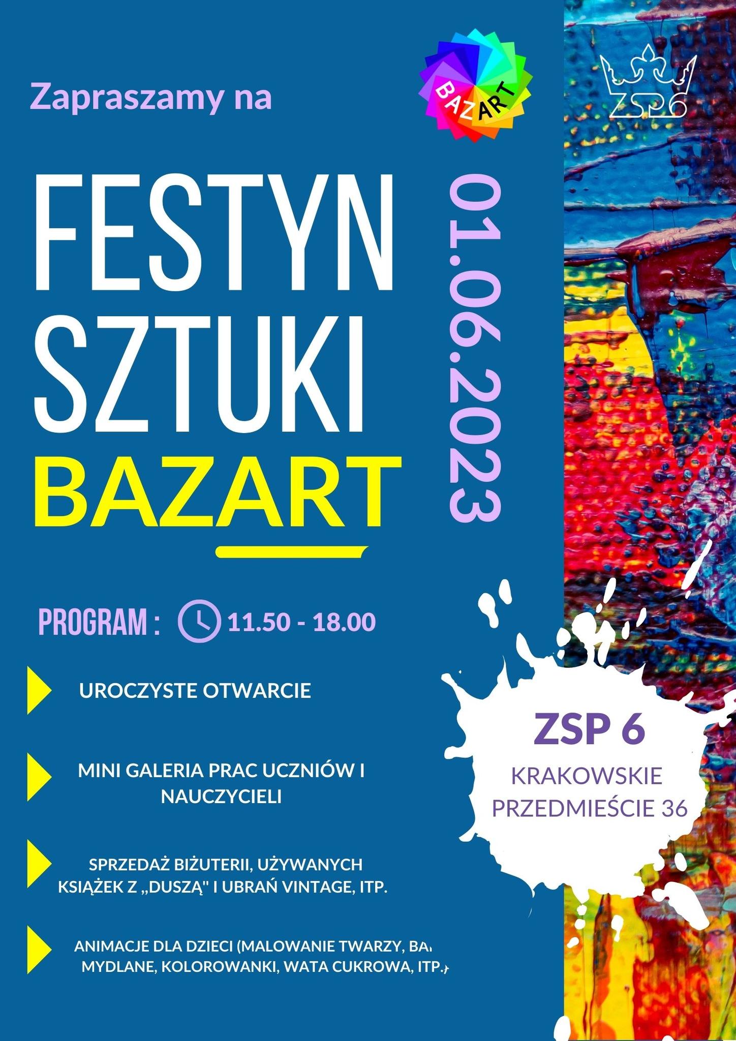 Uczennice klasy 3 Liceum Sztuk Plastycznych w ZSP6 – popularna „Krakówka” wraz z Samorządem Uczniowskim zapraszają mieszkańców Piotrkowa Trybunalskiego oraz powiatu piotrkowskiego na festyn sztuki „bazART”. Podczas festynu będzie można zapoznać się z twórczością młodych artystów zarówno z Liceum Sztuk Plastycznych, jak i z Technikum Menedżersko-Usługowego oraz nauczycieli szkoły.