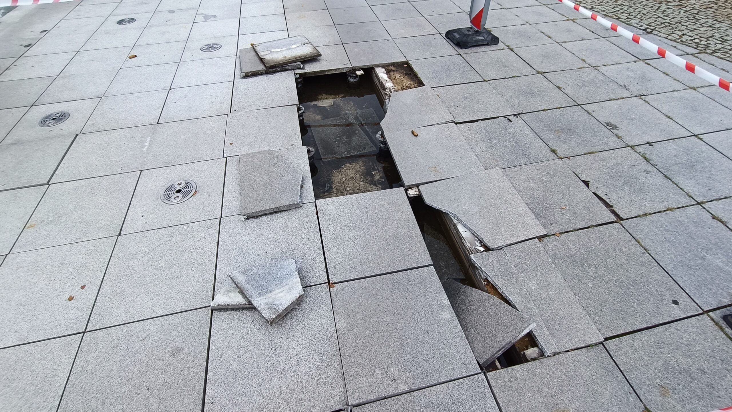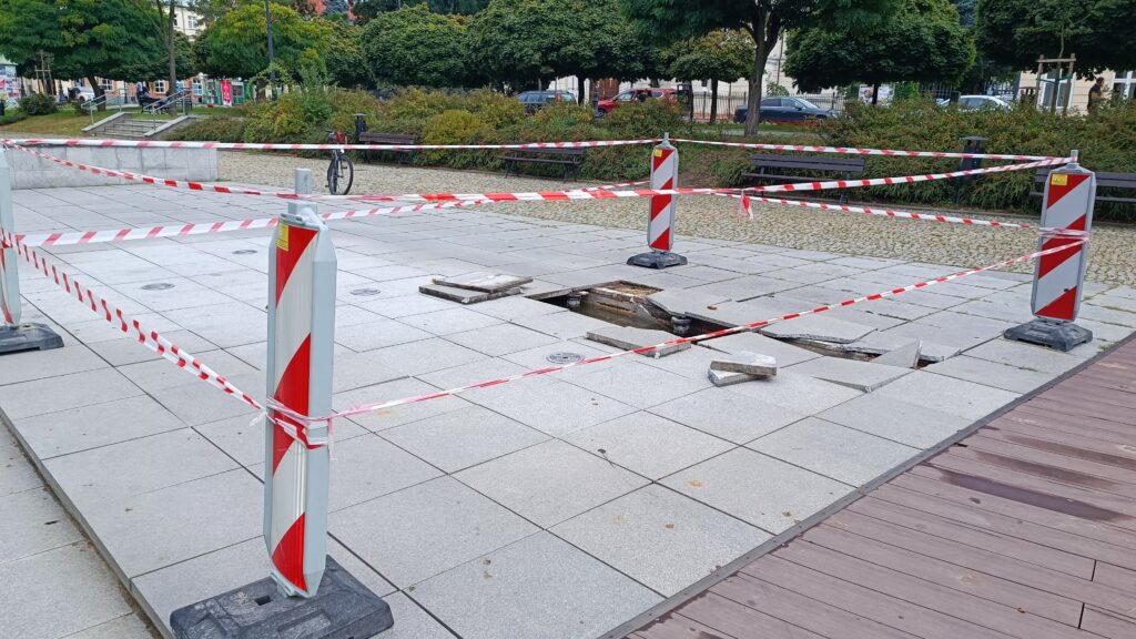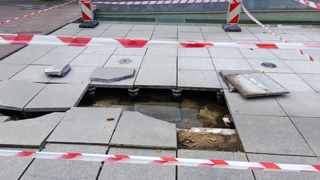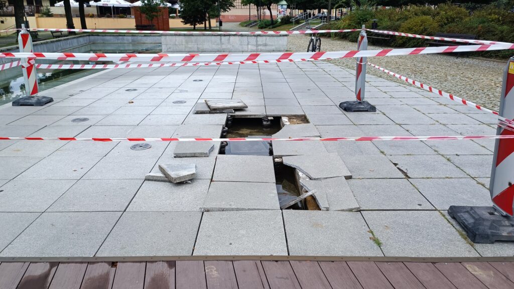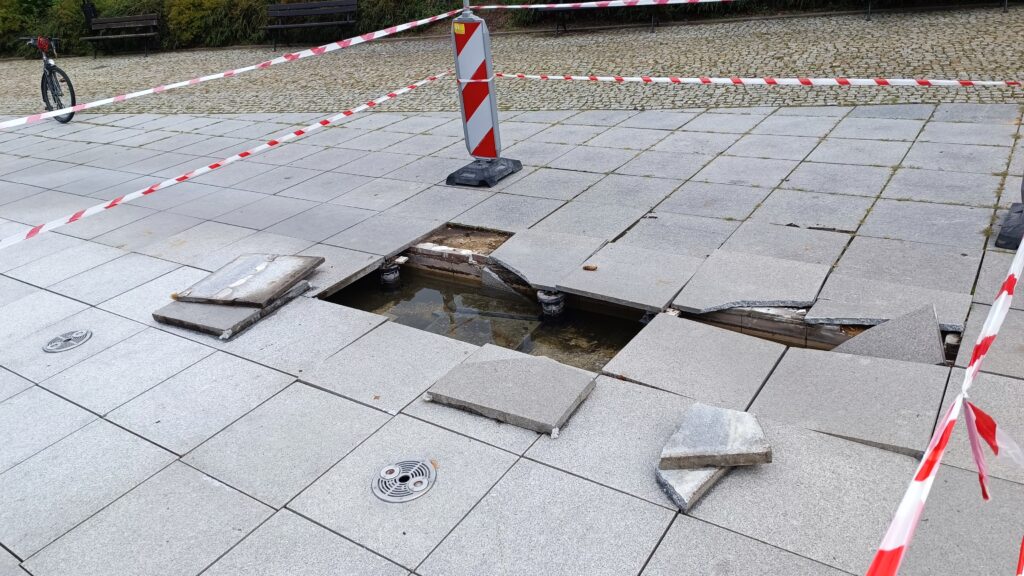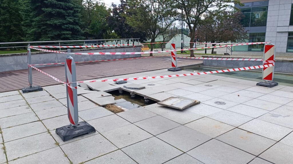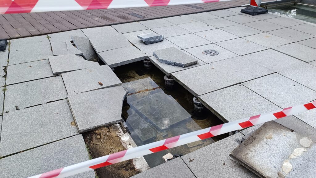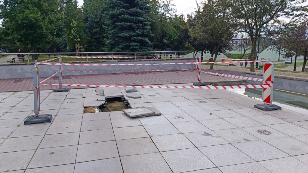 Fontannę uszkodziła prawdopodobnie ciężarówka która wjechała na betonowe płyty. Kierowca food trucka nie wiedział, że pod spodem jest pusta przestrzeń i połamał płyty.