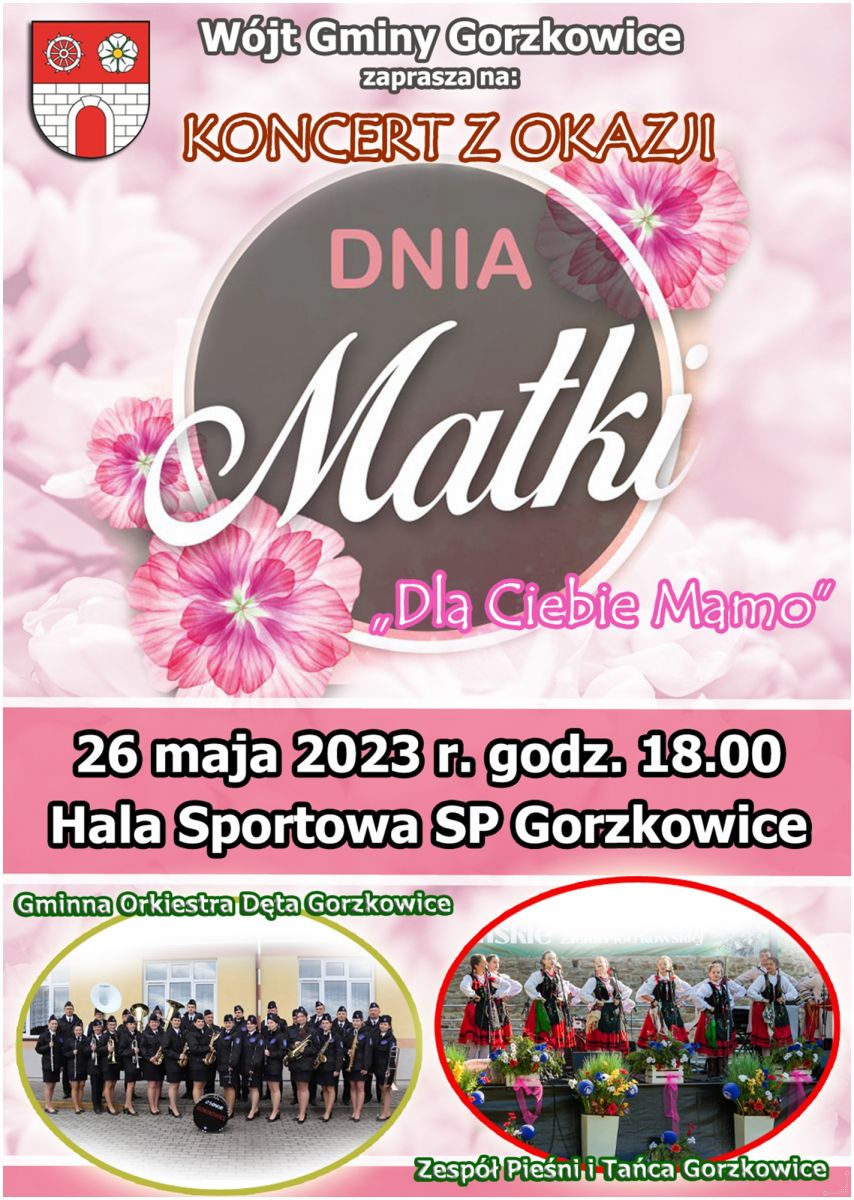 Wójt gminy Gorzkowice zaprasza wszystkie mamy na koncert z okazji Dnia Mamy. Wydarzenie odbędzie się dzisiaj (26 maja) o godzinie 18:00 w hali sportowej Szkoły Podstawowej w Gorzkowicach. Wystąpi Zespół Pieśni i Tańca Gorzkowice oraz Gminna Orkiestra Dęta. Wstęp na koncert jest darmowy.