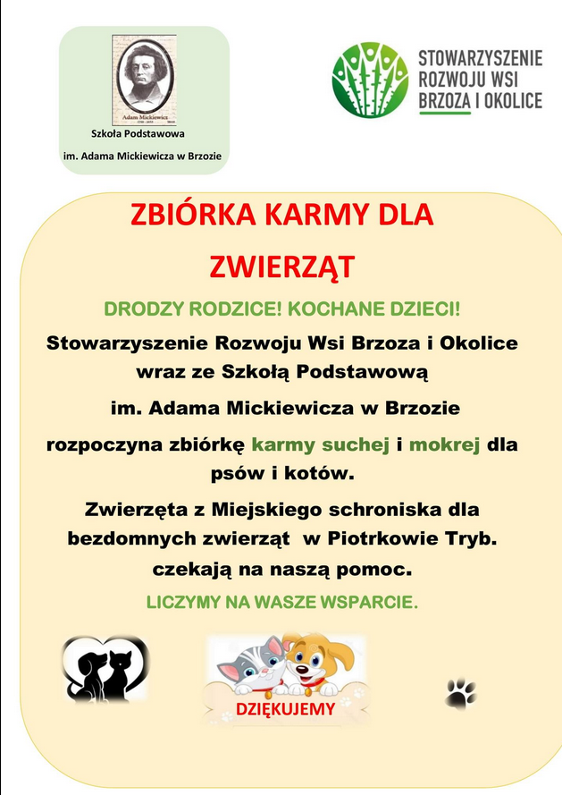 Zbiórkę karmy suchej i mokrej prowadzi Szkoła Podstawowa w Brzozie wraz ze „Stowarzyszeniem Rozwoju wsi Brzoza i Okolice”. To kolejna cenna inicjatywa tego prężnie działającego stowarzyszenia.