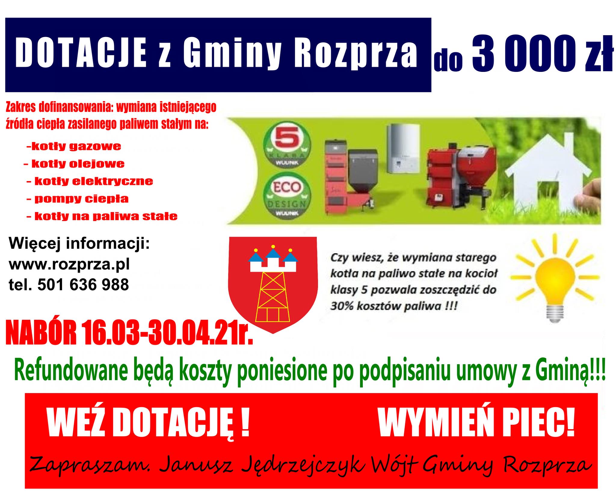Dotacja jest przeznaczona na realizację przedsięwzięć z zakresu ochrony środowiska obejmujących trwałą likwidację systemów ogrzewania, opartych na paliwie węglowym i ich zamianę na ogrzewanie proekologiczne (kotły gazowe, olejowe, elektryczne, pompy ciepła, paliwa stałe) w budynkach mieszkalnych i lokalach mieszkalnych położonych na terenie Gminy Rozprza. Warunkiem montażu kotła na paliwo stałe, jest brak możliwości technicznych podłączenia do sieci dystrybucji gazu.