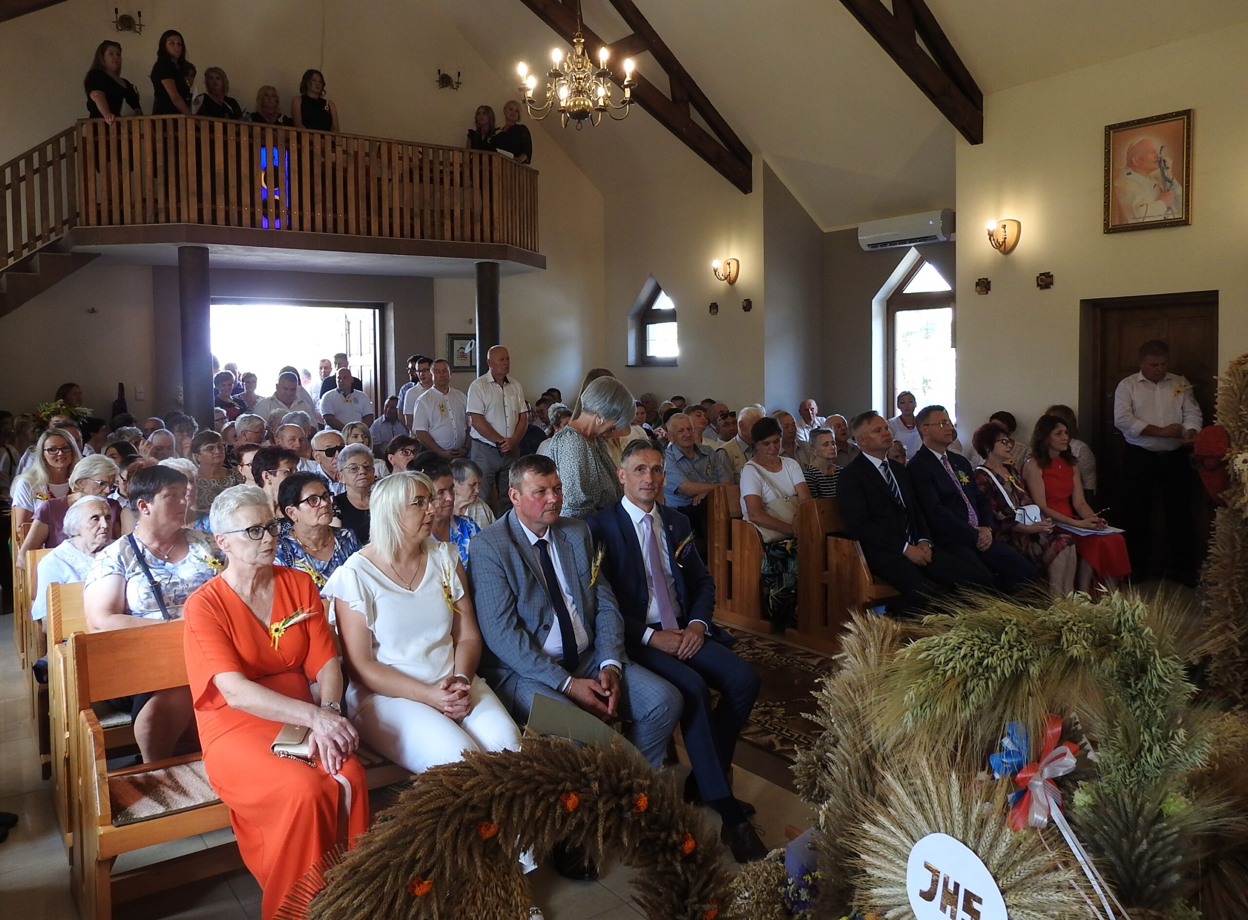 Msza święta dziękczynna za zebrane plony została odprawiona w kaplicy p.w. „Matki Bożej Siewnej” w Aleksandrowie przez ks. Sławomira Spychaja – proboszcza parafii w Dąbrowie nad Czarną oraz księdza kanonika Henryka Dziadczyka – dziekana Dekanatu Przedborskiego. Oprawę muzyczną podczas mszy świętej zapewnili pracownicy Środowiskowego Domu Samopomocy w Dąbrówce. Podczas dziękczynnej mszy świętej, w procesji z darami, został złożony przez starostów dożynek gminnych –Agnieszkę Konecką oraz Mariusza Zamożniewicza- bochen chleba wypieczony z tegorocznych zbiorów i kosz z owocami.