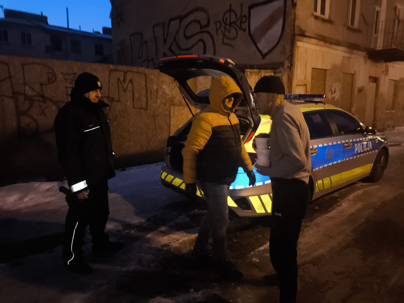 Służby regularnie odwiedzają pustostany w których chronią się osoby w kryzysie bezdomności. Do tej pory potrzebujący mogli liczyć na gorącą herbatę. Teraz pomoc została rozszerzona – podczas wczorajszego wieczornego patrolu każda napotkana osoba otrzymała pożywną, gorącą zupę.