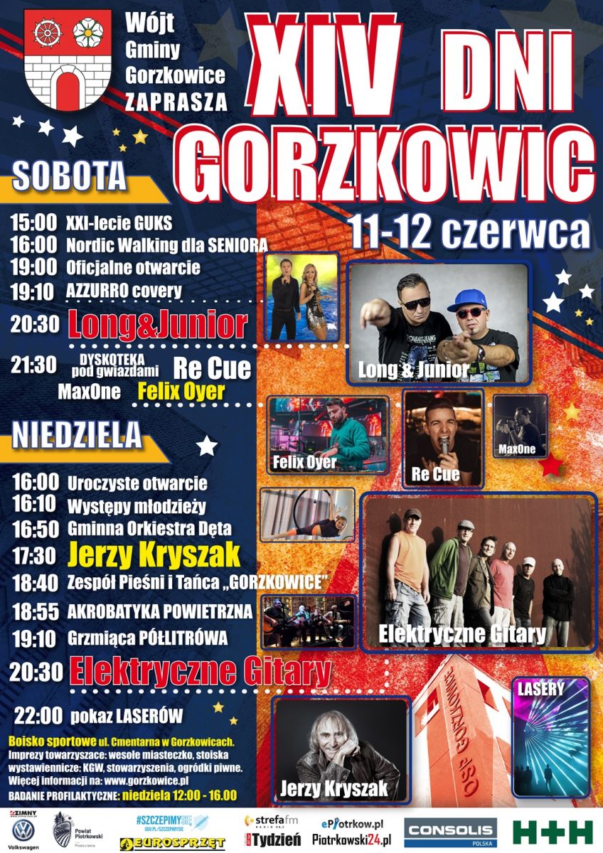 Zapraszamy na XIV Dni Gorzkowic. Mieszkańcy gminy i regionu rozpoczną zabawę już w sobotę 11.06. Tego dnia na scenie pojawi się zespół Azzurro, który zagra covery największych przebojów. Będzie także zespół Long & Junior. O 21:30 dyskoteka pod gwiazdami. Z kolei w niedzielę (12.06) zaprezentuje się Gminna Orkiestra Dęta, Zespół Pieśni i Tańca Gorzkowice, znany komik Jerzy Kryszak, piotrkowska grupa Grzmiąca Półlitrowa, a gwiazdą wieczoru będzie zespół Elektryczne Gitary. Na zakończenie Dni Gorzkowic odbędzie się niezapomniany pokaz laserów.