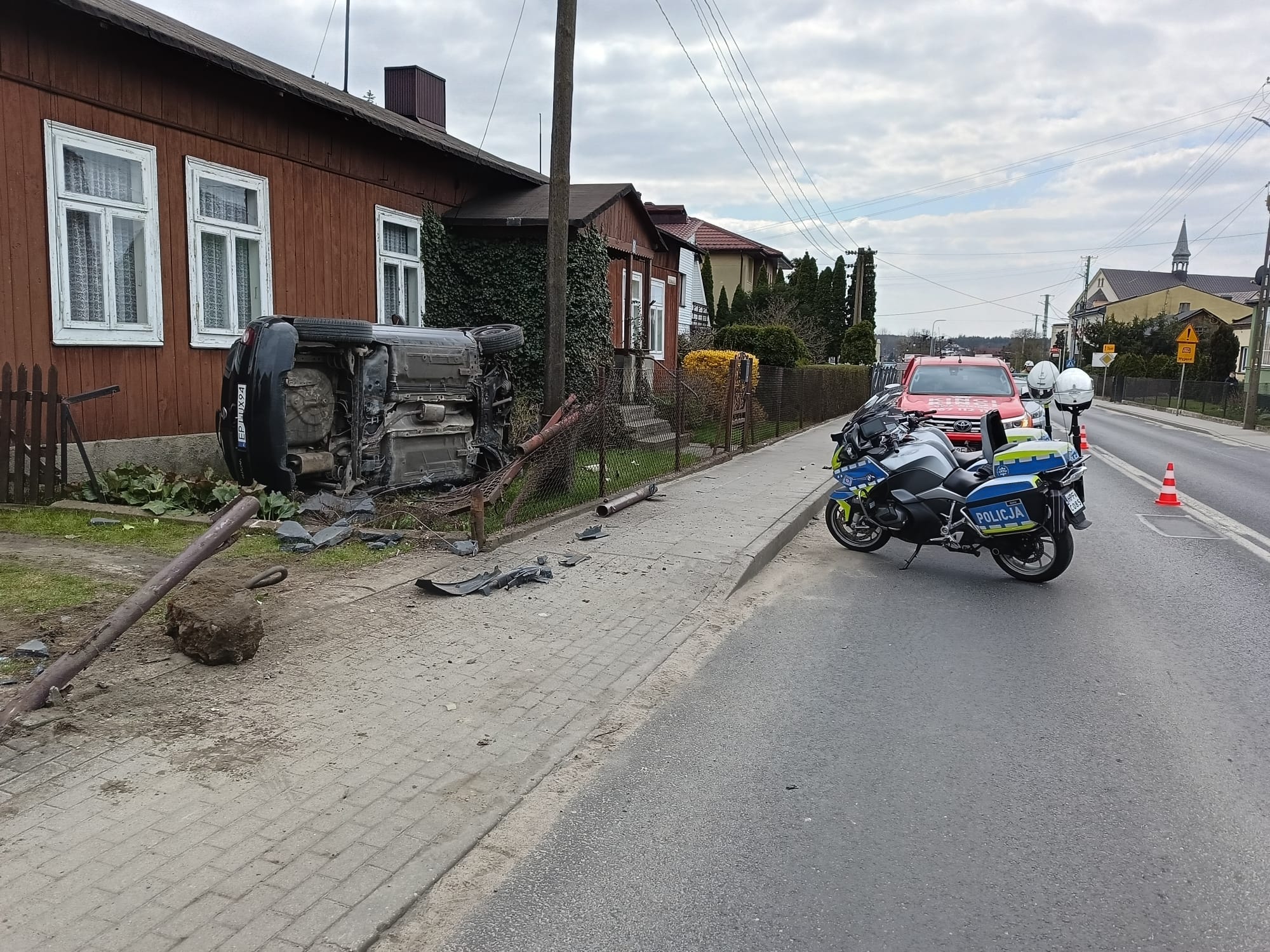Samochód z dużą prędkością uderzył w przydrożne ogrodzenie. Siła uderzenia była tak wielka, że auto przewróciło się na bok. Rozbity pojazd zatrzymał się w bezpośrednim sąsiedztwie domu mieszkalnego.