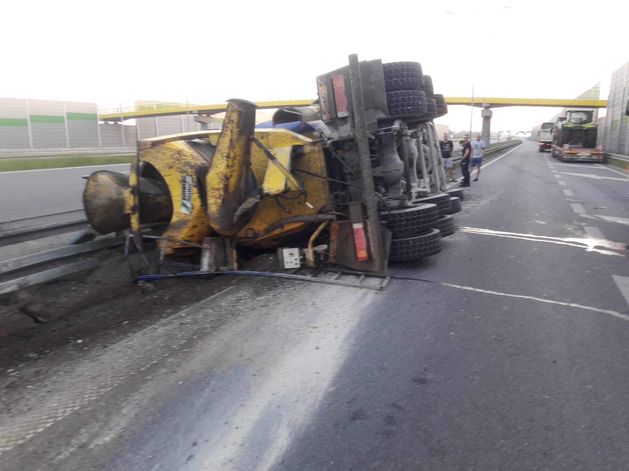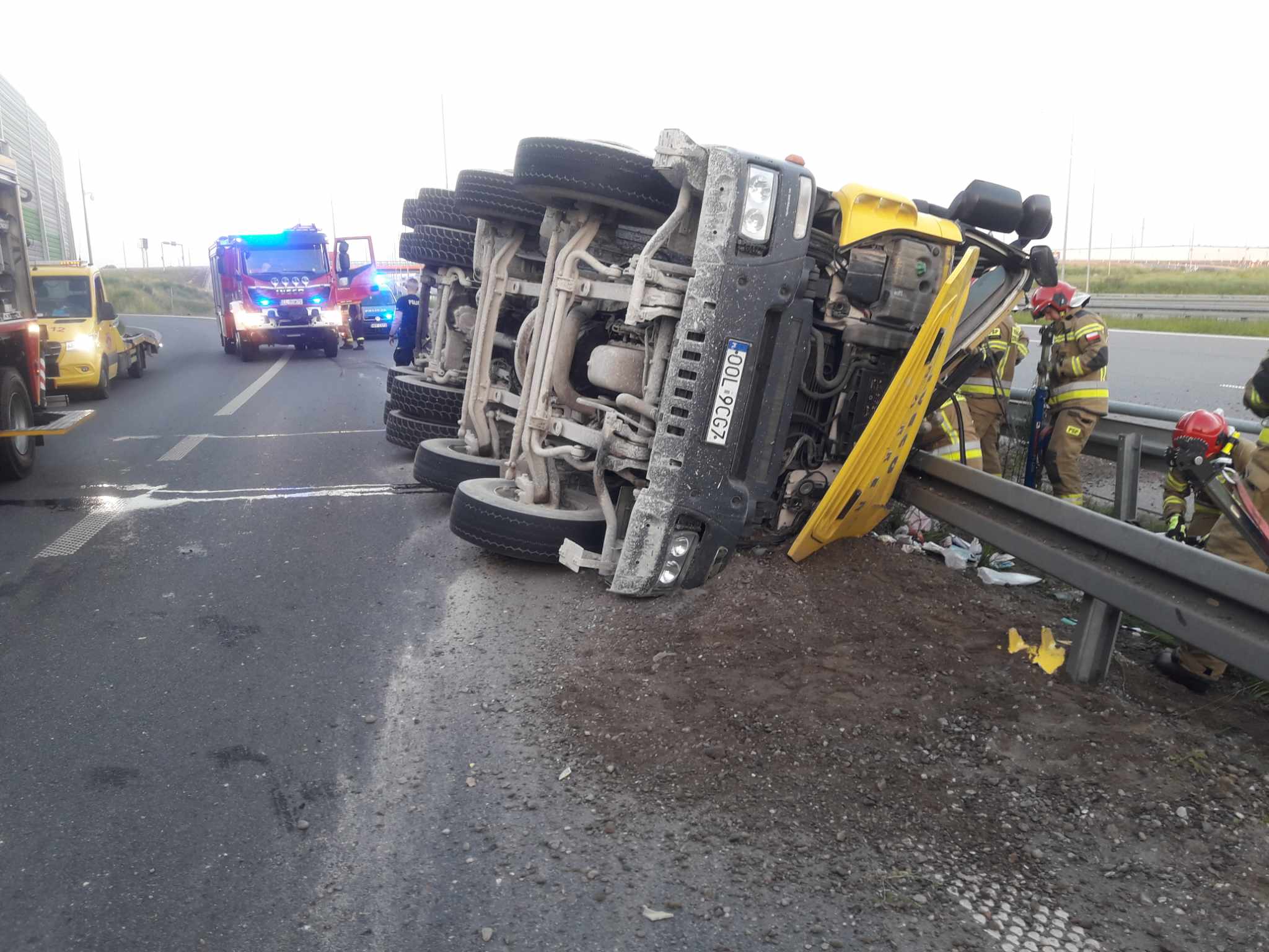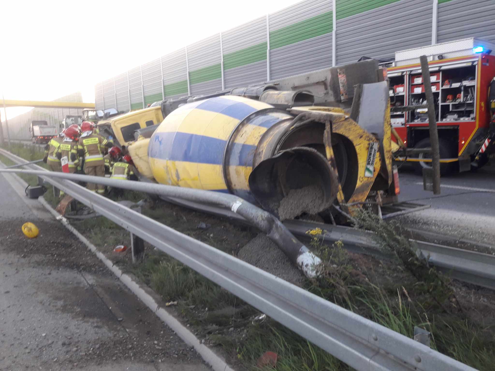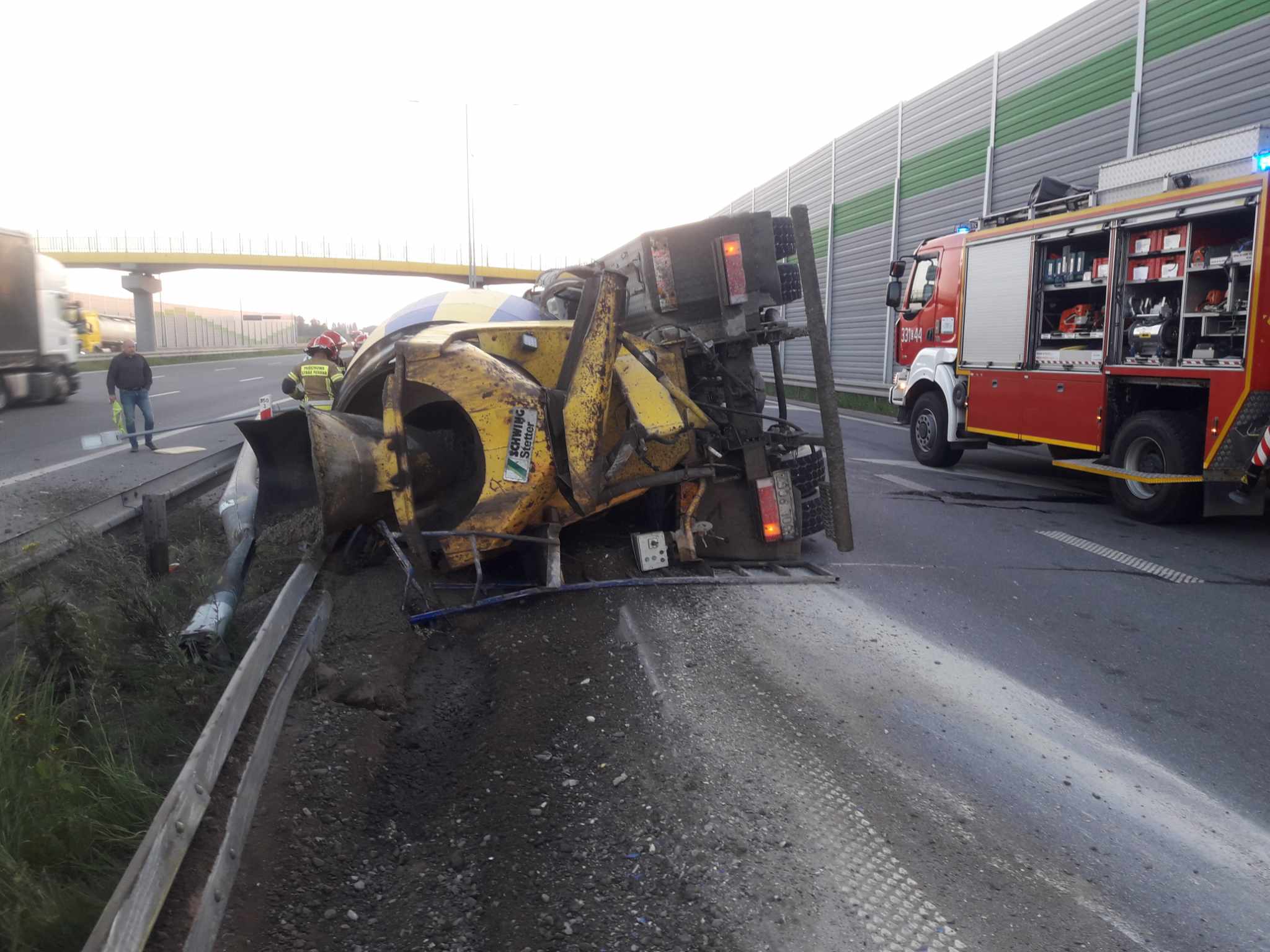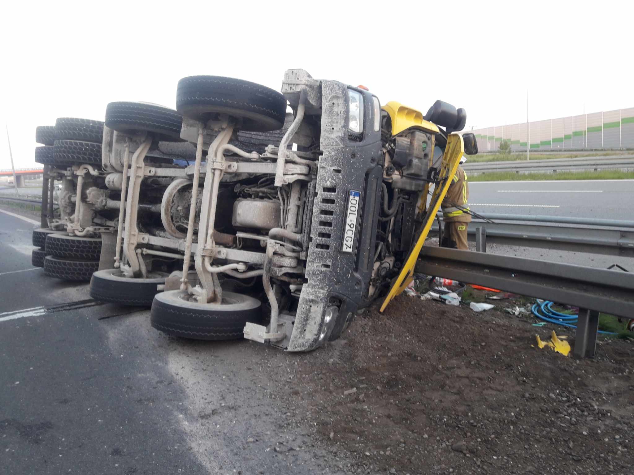 Około 4:30 na autostradzie A1 na węźle Piotrków Trybunalski-Południe na zjeździe z DK74 w kierunku Łodzi i Gdańska, przewróciła się gruszka przewożąca beton. Pojazd uszkodził bariery energochłonne oraz latarnię. Płynny beton wylał się na drogę i do rowu. Kierowcy na szczęście nic się nie stało. Wjazd na autostradę jest zablokowany.