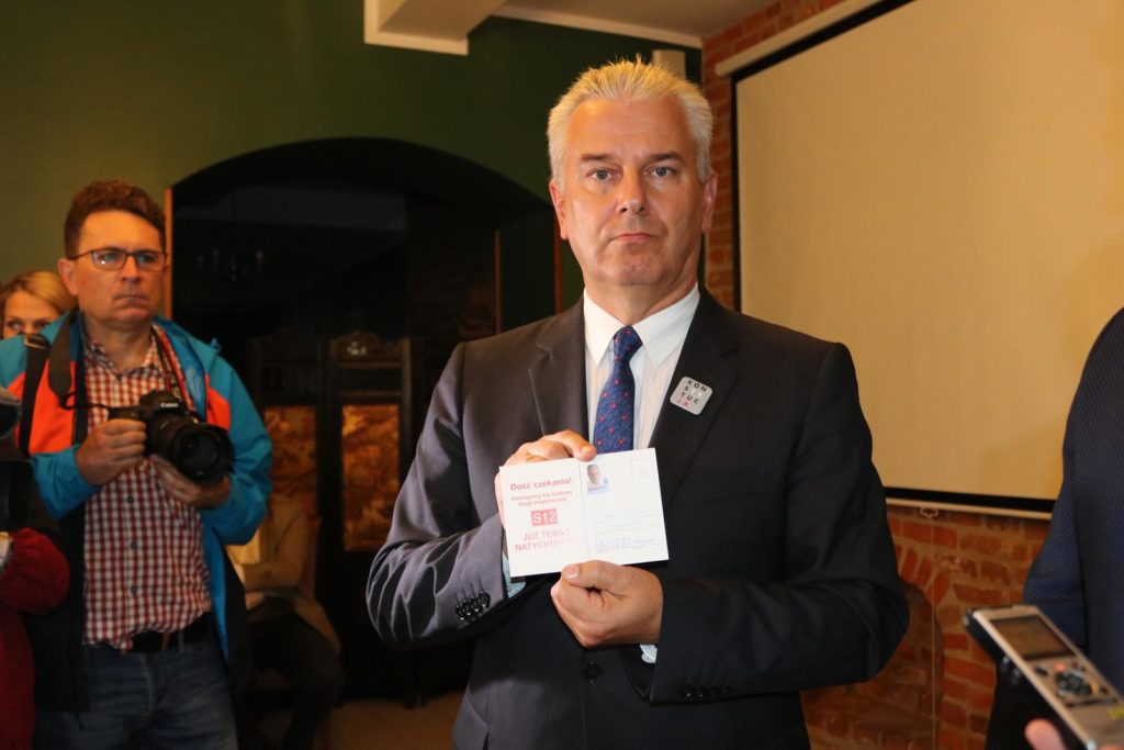 Cezary Grabarczyk zaprezentował także pocztówki zaadresowane do premiera Mateusza Morawieckiego z wezwaniem do natychmiastowego rozpoczęcia budowy S12 – Wystarczy przykleić znaczek i wysłać do premiera – mówił kandydat do Sejmu.