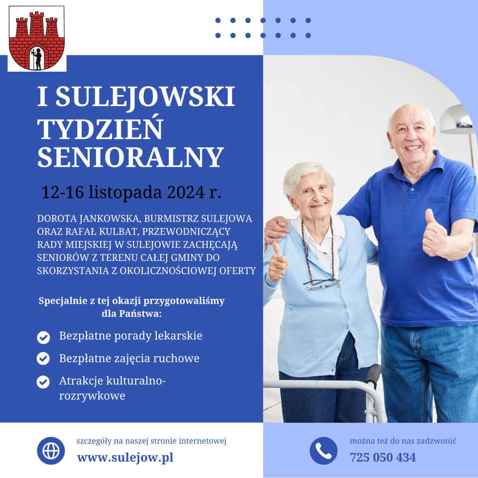 Z okazji Światowego Dnia Seniora sulejowski magistrat przygotował specjalną ofertę dla mieszkańców gminy w wieku 60+, z której seniorzy będą mogli skorzystać od 12 do 16 listopada 2024 roku. Dorota Jankowska, burmistrz Sulejowa oraz Rafał Kulbat, przewodniczący Rady Miejskiej w Sulejowie zachęcają do wzięcia udziału w bezpłatnych konsultacjach lekarskich, bezpłatnych zajęciach ruchowych oraz specjalnym koncercie i warsztatach, które oczywiście też będą bezpłatne.
