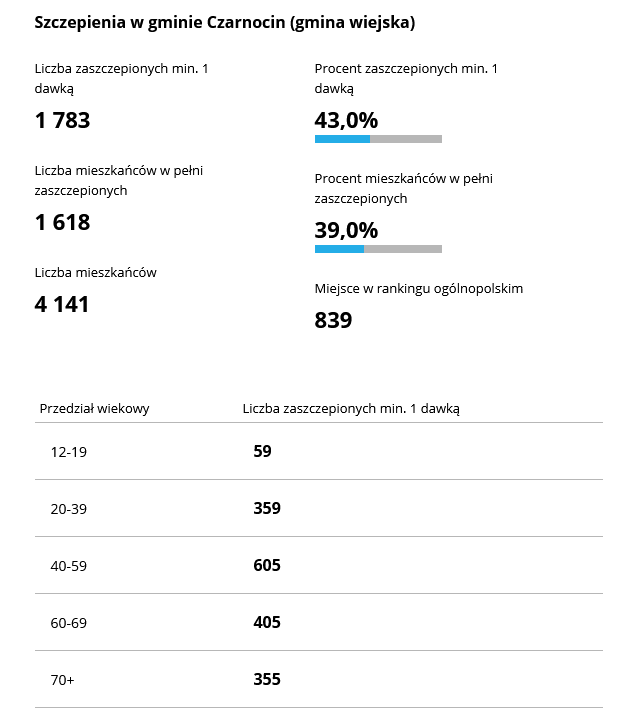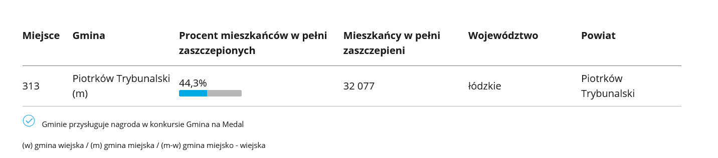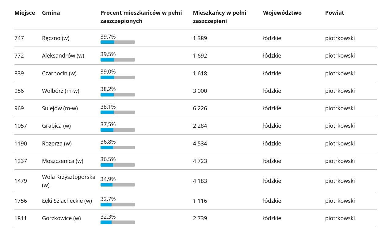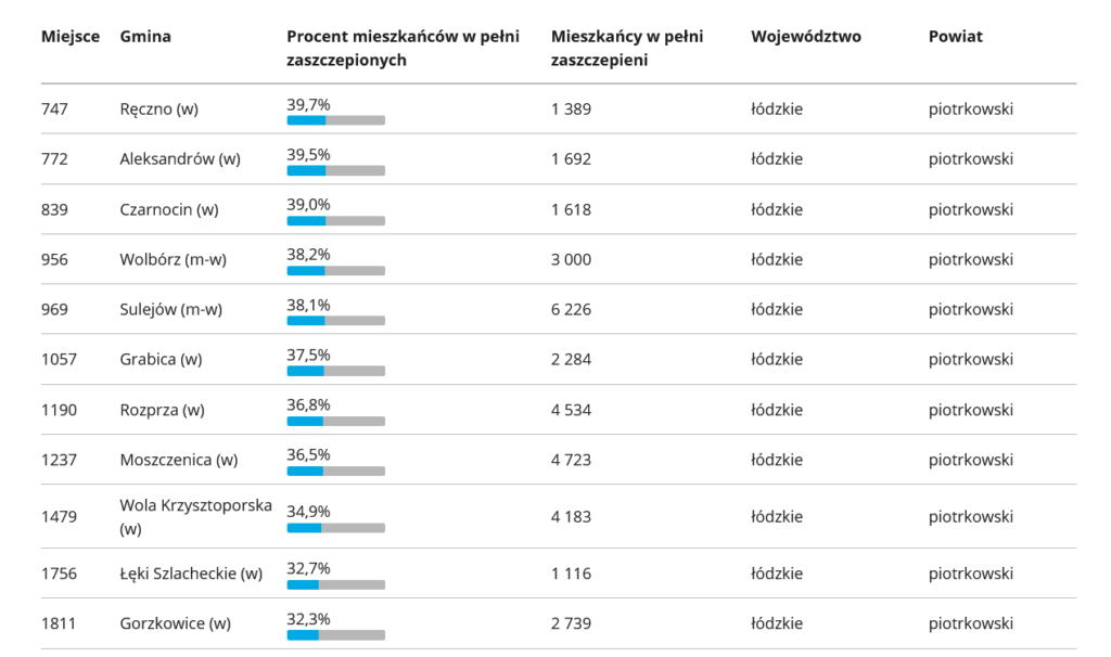 Na stronach rządowych sprawdzić można „wyszczepialność” poszczególnych gmin w Polsce. Na pierwszym miejscu jest Podkowa Leśna (woj. mazowieckie) gdzie zaszczepionych jest 61% wszystkich mieszkańców gminy. Na końcu rankingu jest Czarny Dunajec (woj. małopolskie), gdzie zaszczepionych jest zaledwie 15,4% mieszkańców gminy. Jak w rankingu wypada Piotrków Trybunalski i poszczególne gminy powiatu? SPRAWDZAMY!