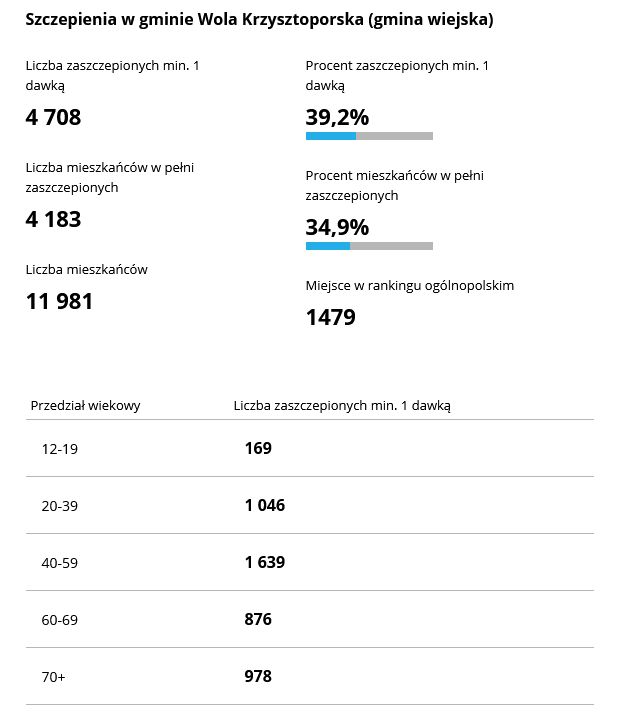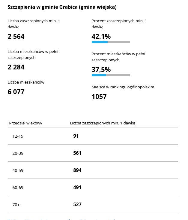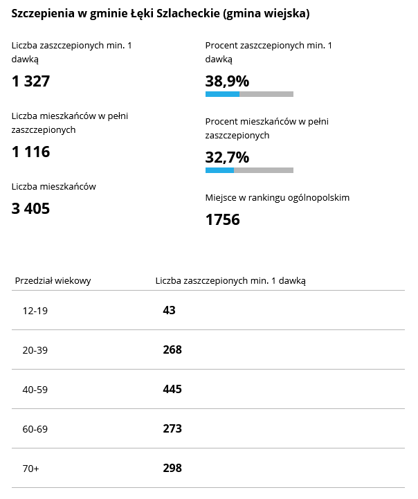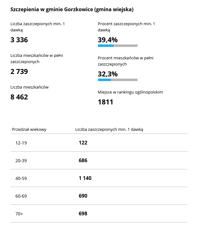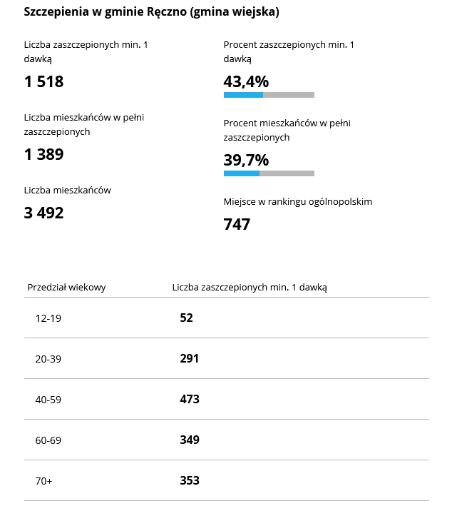 Z kolei gminą powiatu piotrkowskiego, w której zaszczepionych jest najwięcej mieszkańców jest gmina Ręczno w której zaszczepiło się 39.7% mieszkańców. Najmniej osób zaszczepiło się w gminie Gorzkowice – 32,3% mieszkańców gminy.