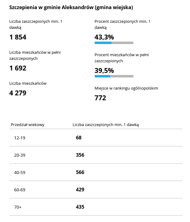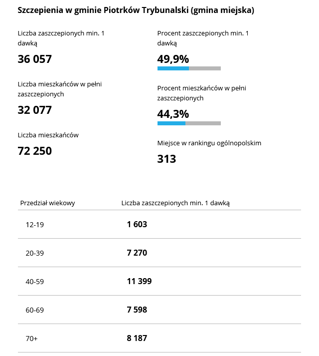 Piotrków Trybunalski jest na 313 miejscu w kraju i 21 w województwie pod względem wyszczepielności. Na pierwszym miejscu jest stolica regionu. Według informacji dostępnych na stronie rządowej, w Łodzi zaszczepionych jest 52% społeczeństwa, a w naszym mieście 44,3%.