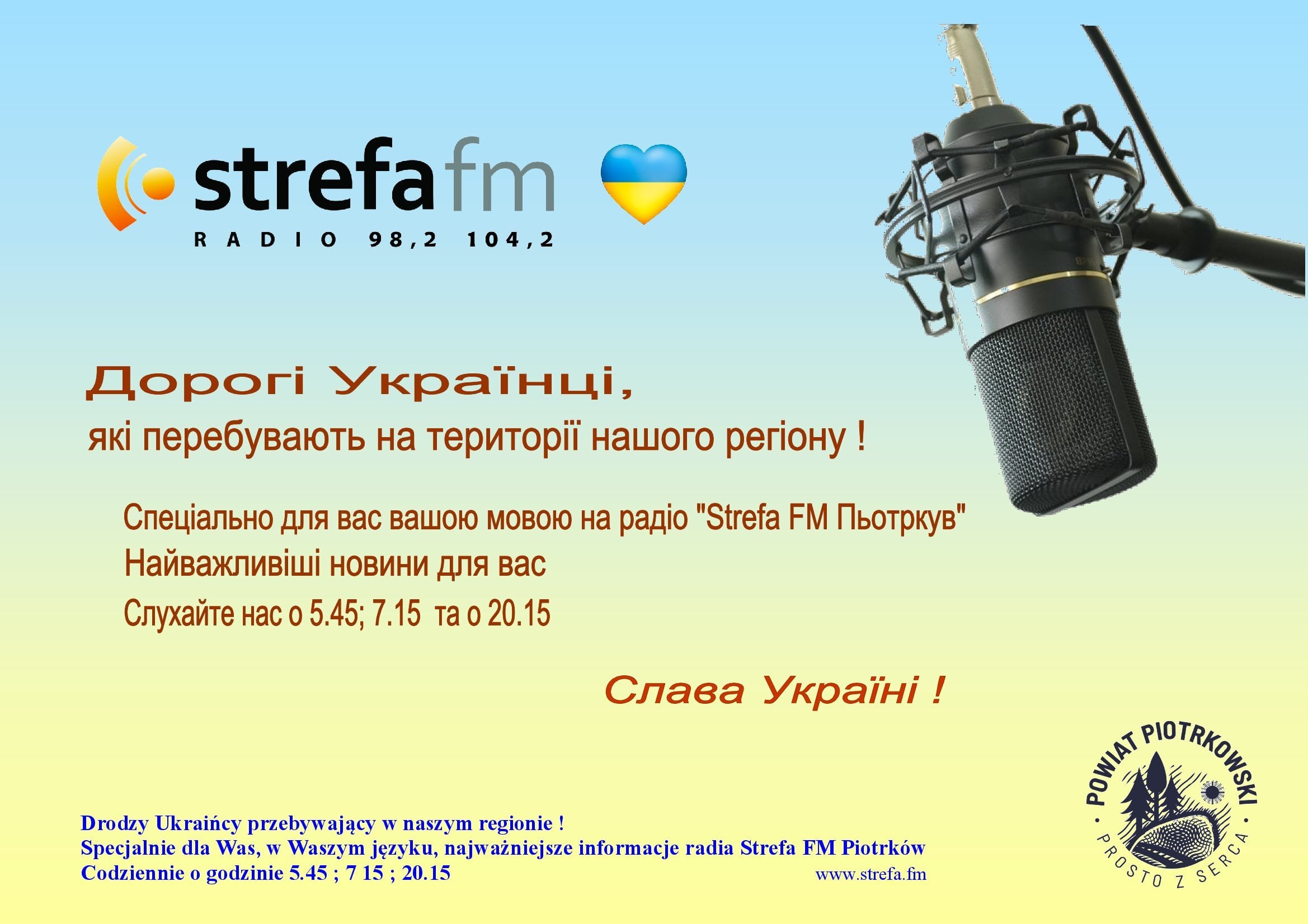 Drodzy Ukraińcy przebywający w naszym regionie! Specjalnie dla Was, w Waszym języku, najważniejsze informacje radia Strefa FM Piotrków. Codziennie o godzinie 5:45; 7:15; 20:15.