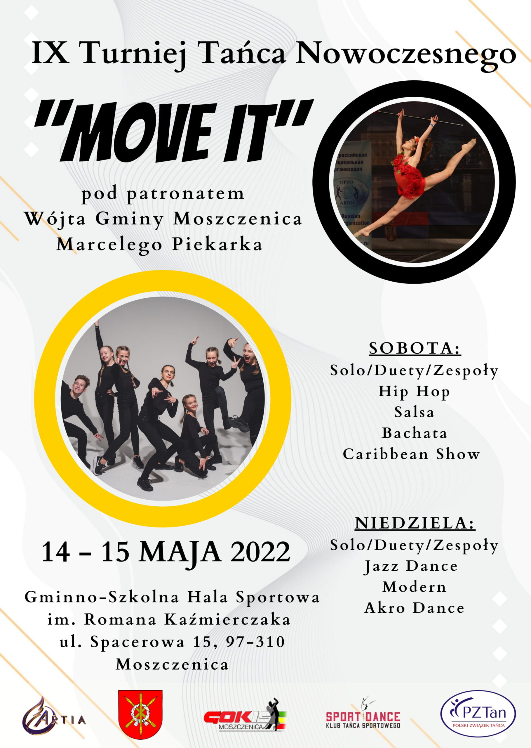 IX Turniej Tańca Nowoczesnego „Move It” pod patronatem Wójta Gminy Moszczenica Marcelego Piekarka już 14 i 15 maja w hali w Gminno-Szkolnej Hali Sportowej im. Romana Kaźmierczaka w Moszczenicy!