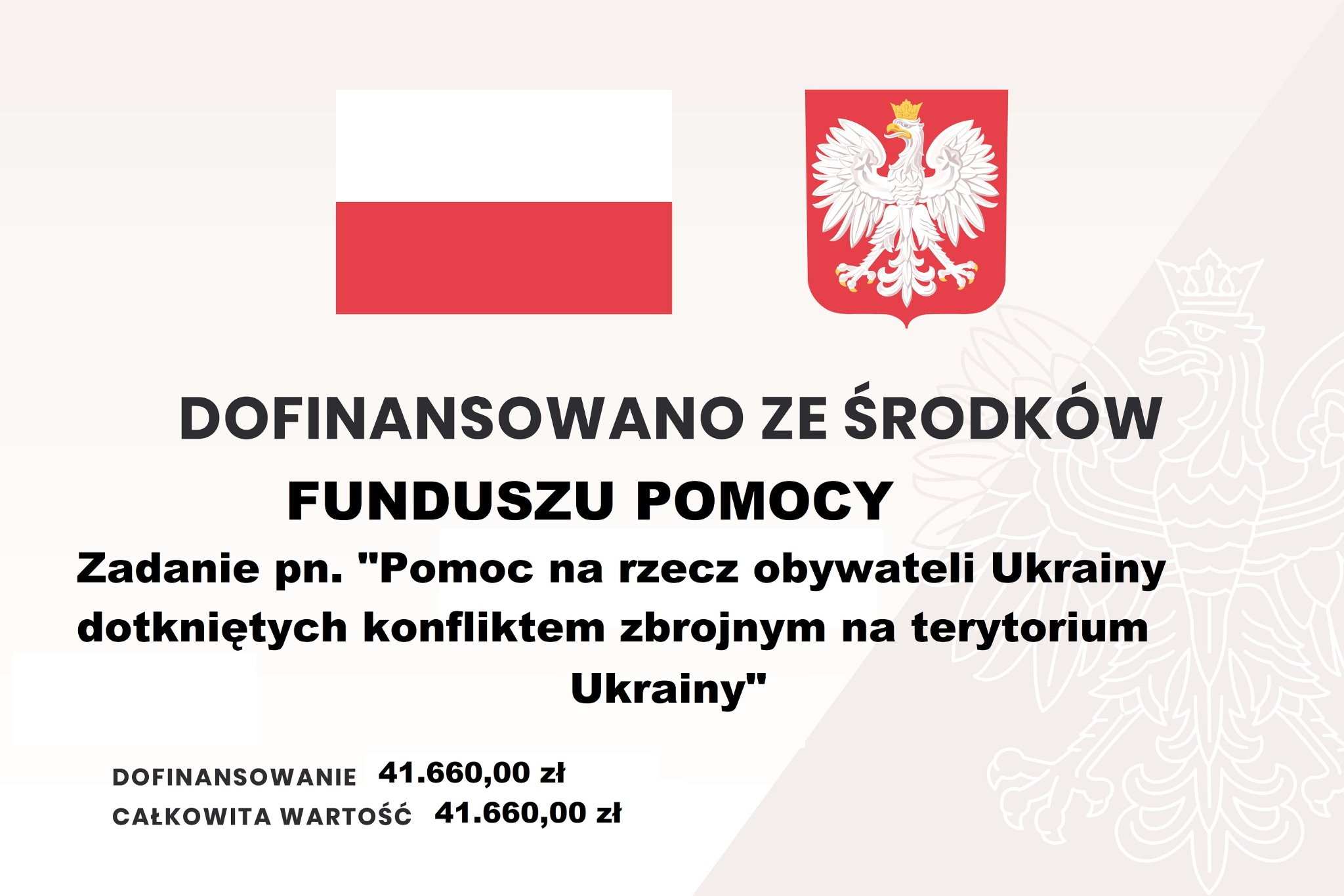 Pomoc finansowana ze środków Funduszu Pomocy w ramach zadania publicznego zleconego przez Wojewodę Łódzkiego pod tytułem „Pomoc na rzecz obywateli Ukrainy dotkniętych konfliktem zbrojnym na terytorium Ukrainy”.