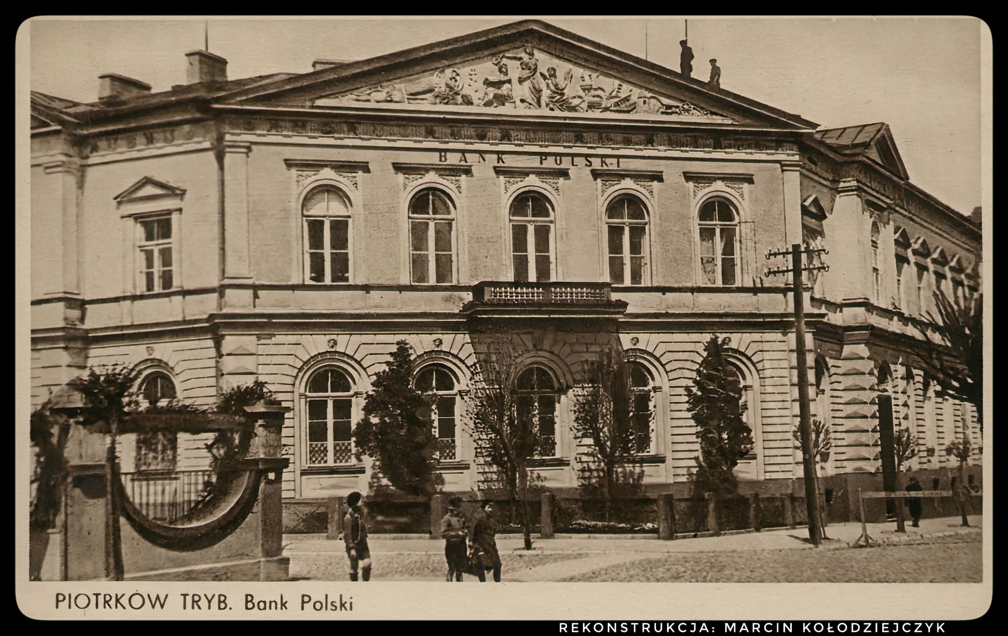 Oglądając archiwalne zdjęcia czy też pocztówki z pejzażem piotrkowskich ulic z przełomu XIX i XX wieku, nie trudno nie zauważyć, jak spore zaszły zmiany w wyglądzie elewacji bankowego gmachu. Zniknął z frontowej ściany budynku nie tylko balkon, ale również piękna, misternie wykonana płaskorzeźba, alegoria rozwoju rolnictwa w guberni piotrkowskiej, umieszczona tuż nad oknami pierwszego piętra głównej części korpusu gmachu. Rzeźbę tę wykonał Teodor Skonieczny (1852-1910), ten sam, który wyrzeźbił posągi Matki Bożej w typie Immaculata oraz św. Józefa z Dzieciątkiem zdobiące siedzibę Domu Sierot Warszawskiego Towarzystwa Dobroczynności, a dziś są ozdobą parku przy kościele w Lipkowie, jak i twórca wielu pomników na warszawskich Powązkach oraz na Cmentarzu na Rossie w Wilnie. Zmiany w zewnętrznym wystroju architektonicznym gmachu w dużym stopniu są wynikiem wojennych zniszczeń z pierwszych dni września 1939 roku. Gmach Banku Polskiego był jednym z pierwszych budynków, jakie zbombardowały samoloty niemieckiego Luftwaffe. Po wojnie zaś nieudolne ekipy remontowo-budowlane nie potrafiły odtworzyć pierwotnego wyglądu budynku. Ostatecznego zniszczenia XIX-wiecznych cech budynku dokonał jego remont prowadzony nazbyt pospiesznie pod koniec lat 70. z okazji Centralnych Dożynek (wtedy też swój oryginalny, warszawsko-wiedeński wystrój stracił piotrkowski dworzec).