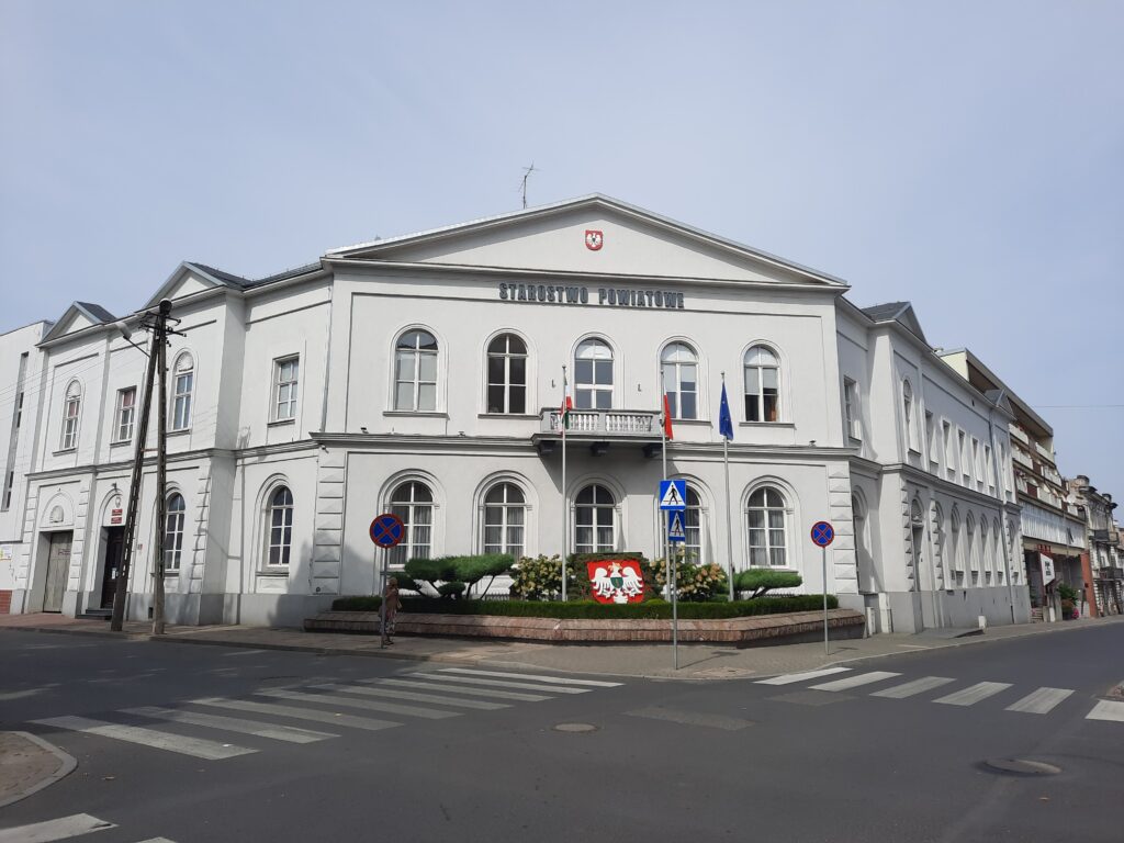 Gmach przy ulicy Dąbrowskiego 7, będący obecnie siedzibą Starostwa Powiatowego w Piotrkowie, to jeden z najbardziej reprezentacyjnych i okazałych budynków w Piotrkowie. Drugi taki po gmachu sądów, zwanym Pałacem Sprawiedliwości. Do 1999 roku był siedzibą Wojewódzkiego Oddziału Narodowego Banku Polskiego, później przez pięć lat rezydował w nim jeden z komercyjnych banków (ten, który udzielił Jerzemu Hoffmanowi kredytu na realizację superprodukcji „Ogniem i mieczem”), a w latach 2004-2010 uczyli się w jego murach studenci Uniwersytetu Medycznego w Łodzi. Przez kolejne cztery lat gmach stał pusty. Jako własność Skarbu Państwa został przekazany w formie darowizny miastu, a to przekazało nieruchomość ww. Starostwu Powiatowemu. Piętrowy budynek o architektonicznych cechach klasycystycznych, kryjący w swym wnętrzu między innymi okazałą klatkę schodową i miejsce na skarbiec w podziemiach, przez ponad 150 lat najbogatszym budynkiem w mieście. Można rzec, że dosłownie stał na pieniądzach.