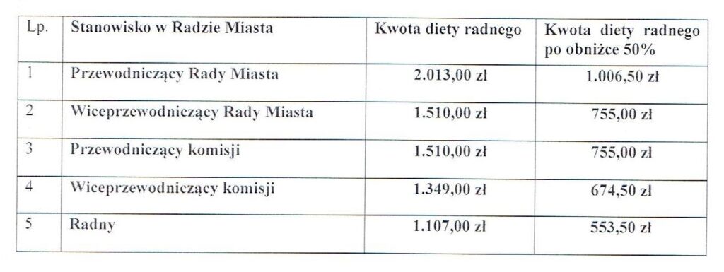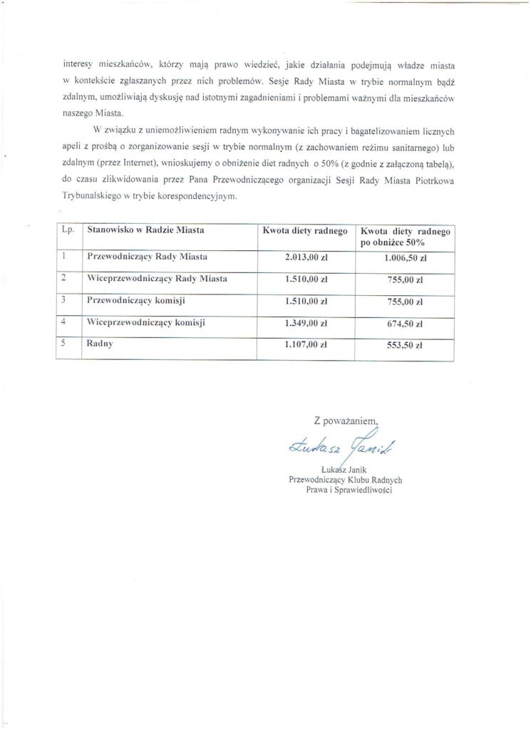 W związku z uniemożliwieniem radnym wykonywanie ich pracy i bagatelizowaniem licznych apeli z prośbą o zorganizowanie sesji w trybie normalnym (z zachowaniem reżimu sanitarnego) lub zdalnym (przez Internet), wnioskujemy o obniżenie diet radnych o 50% (z godnie z załączoną tabelą), do czasu zlikwidowania przez Pana Przewodniczącego organizacji Sesji Rady Miasta Piotrkowa Trybunalskiego w trybie korespondencyjnym.