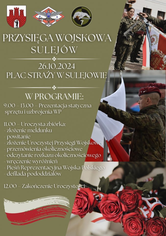 W imieniu żołnierzy 7. Batalionu 25. Brygady Kawalerii Powietrznej imienia księcia Józefa Poniatowskiego zapraszamy na uroczystą przysięgę wojskową, która odbędzie się w sobotę, 26 października 2024 roku na Placu Straży w Sulejowie. Przysięgę złożą żołnierze VIII turnusu szkolenia podstawowego dobrowolnej zasadniczej służby wojskowej.