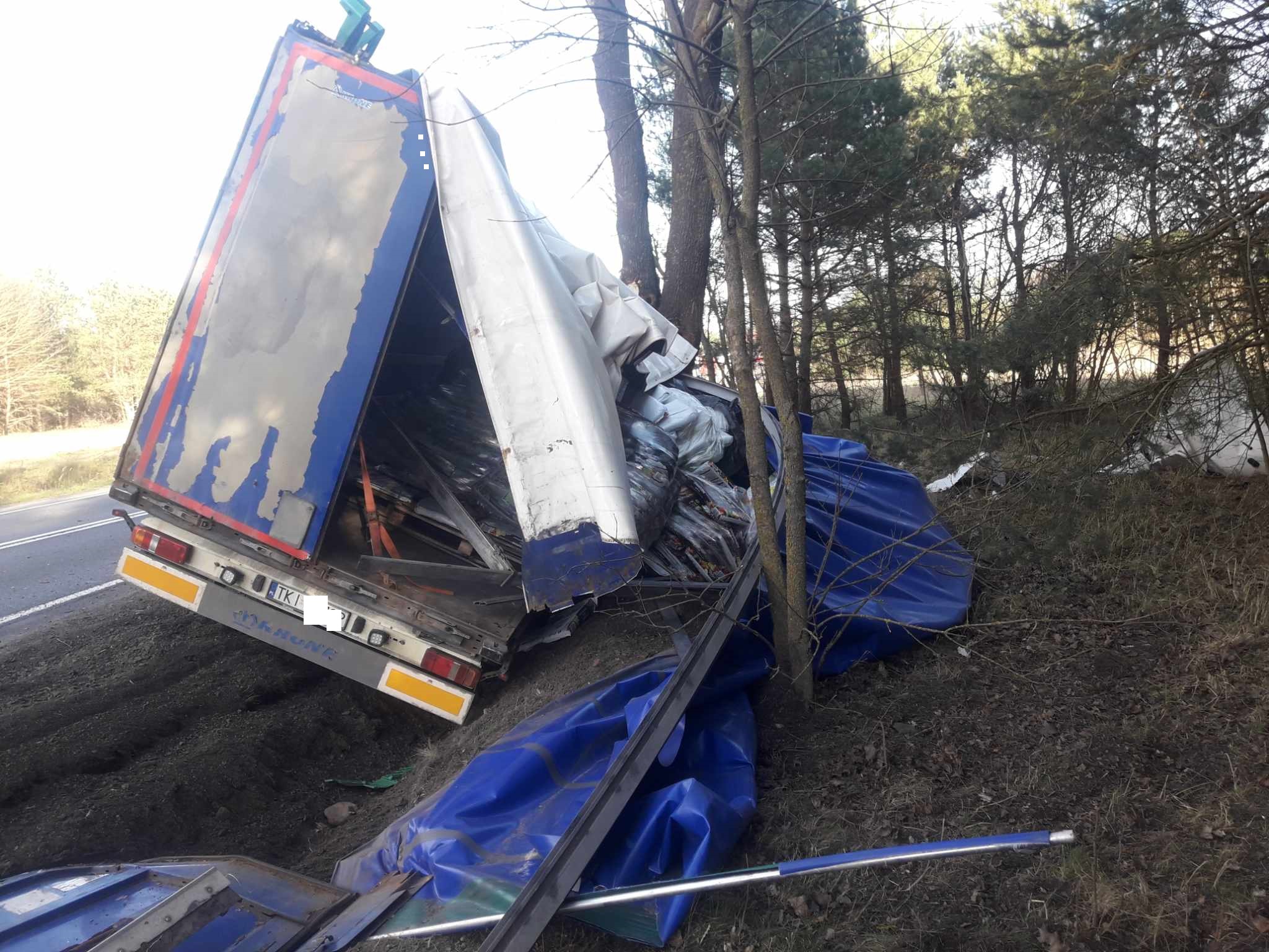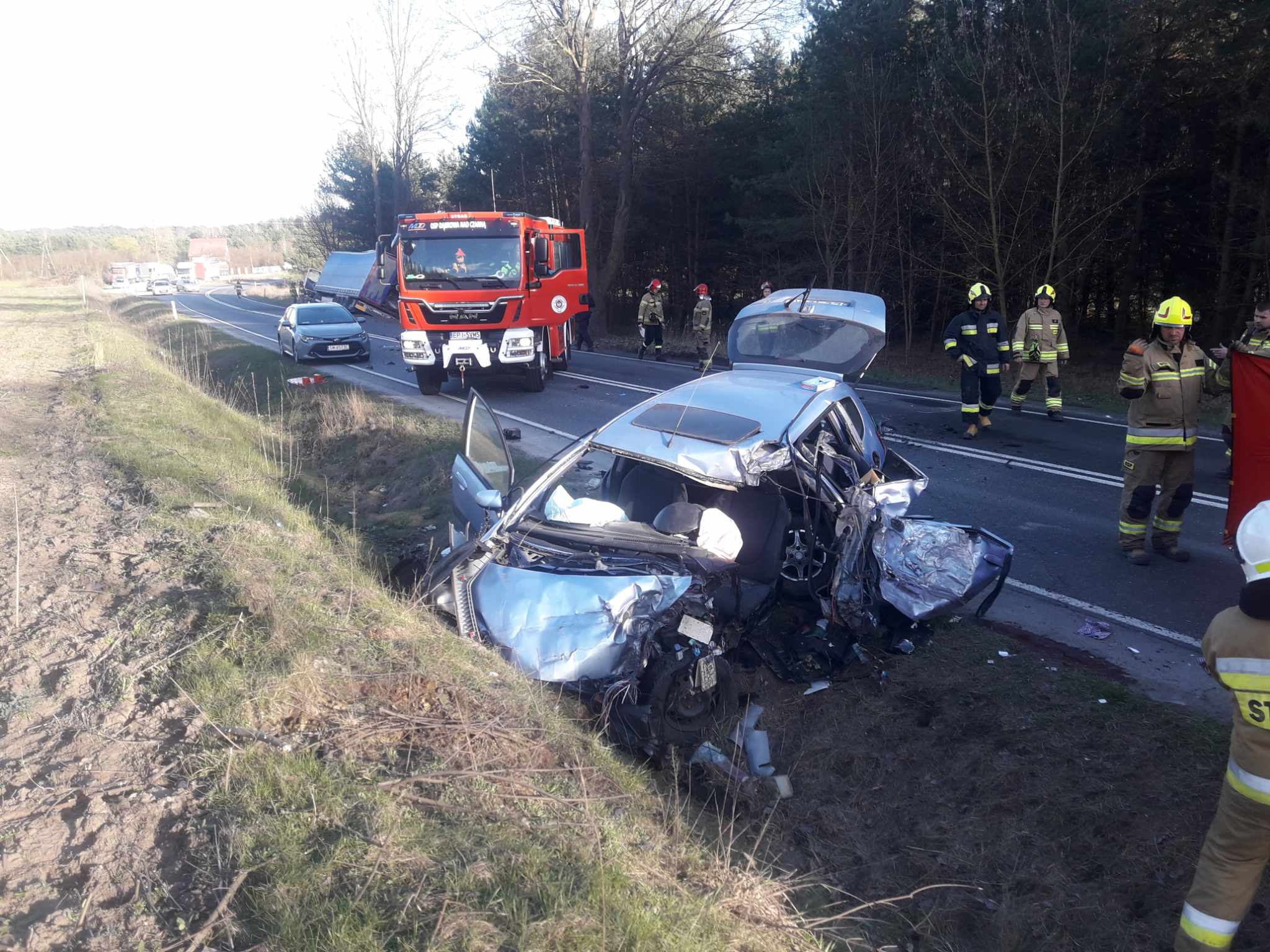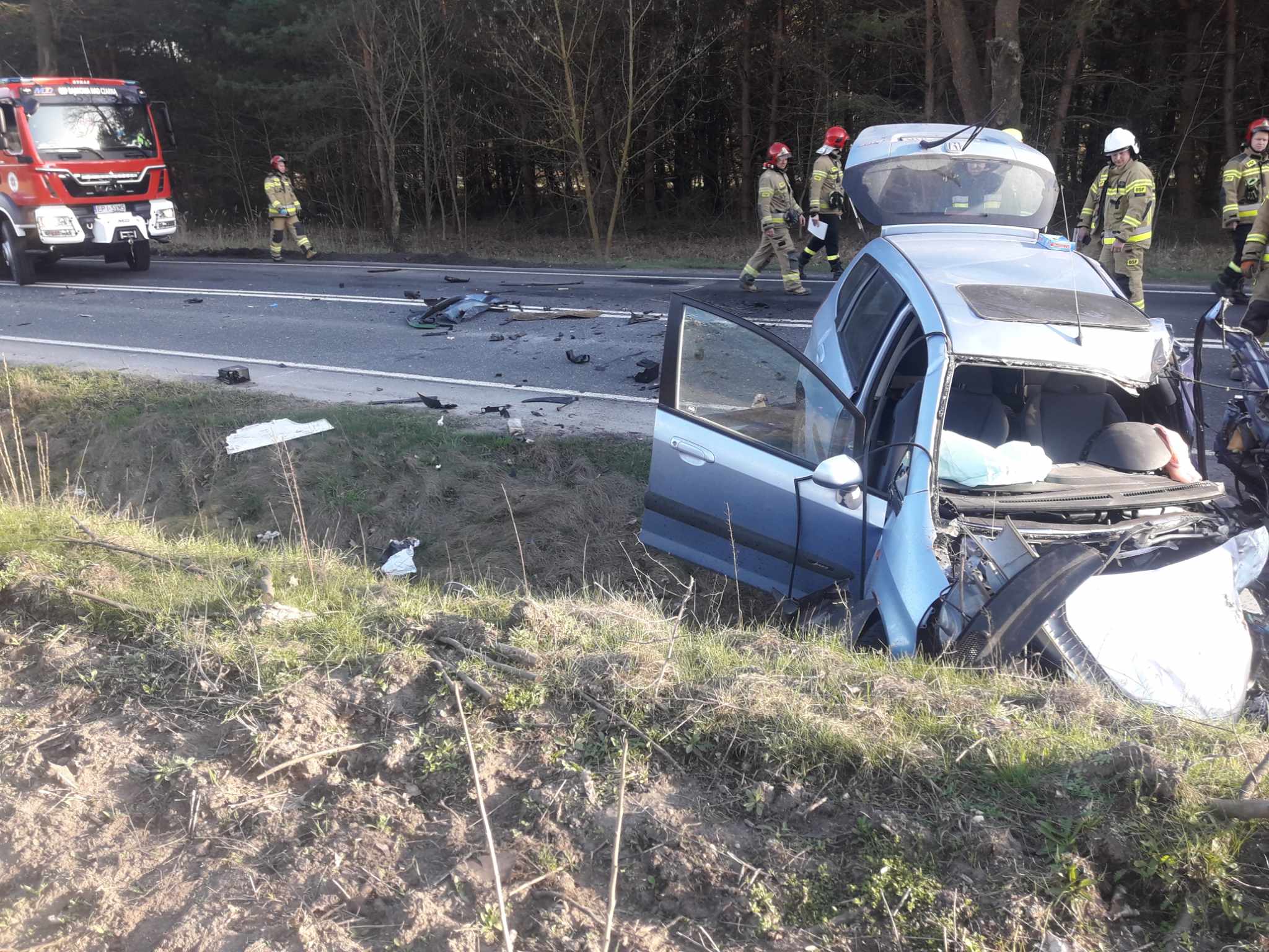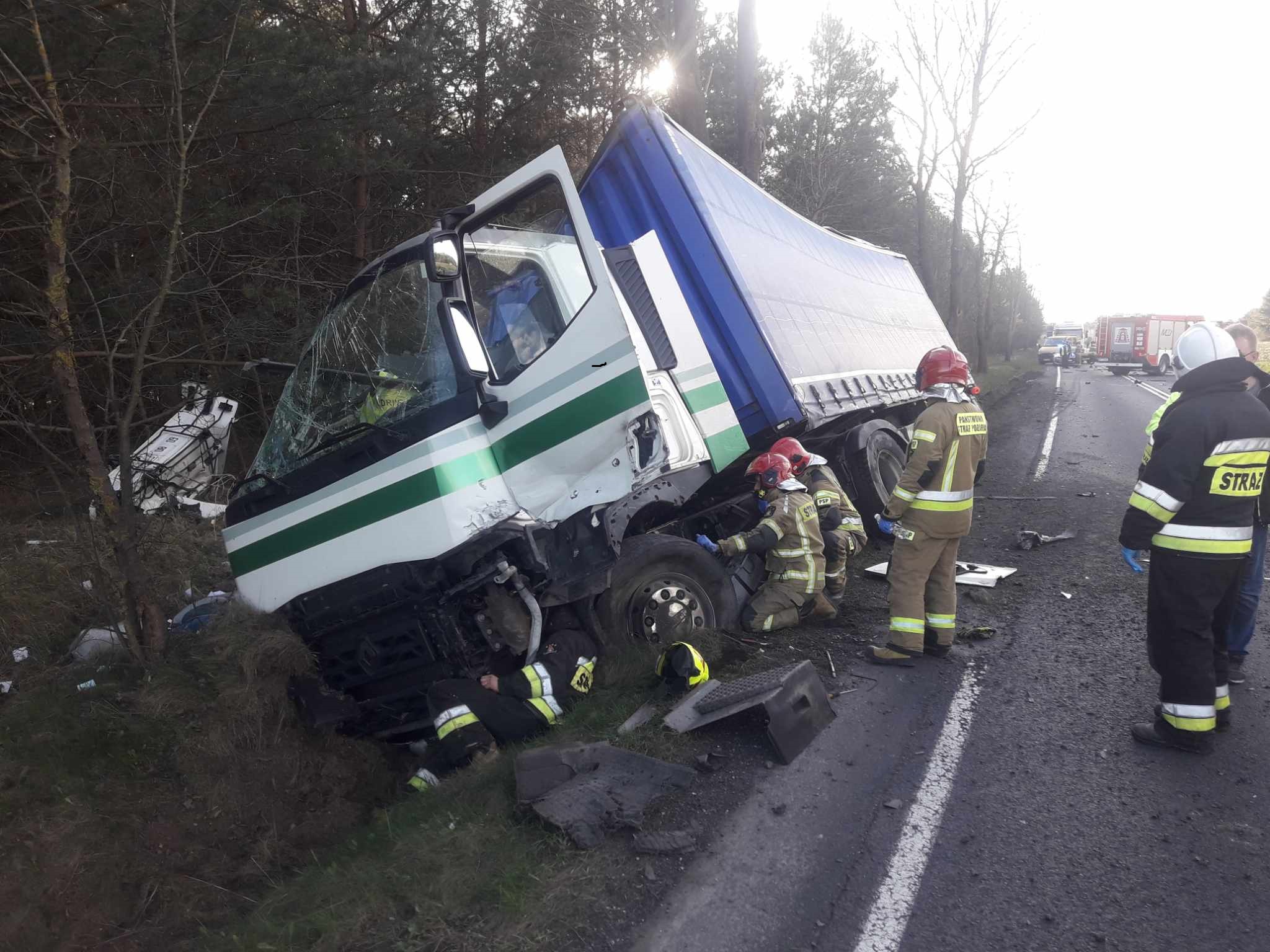 Kierowca ciężarówki, prawdopodobnie ratując się przed zderzeniem, zjechał w prawo i wpadł do rowu. Na miejscu był także śmigłowiec LPR.