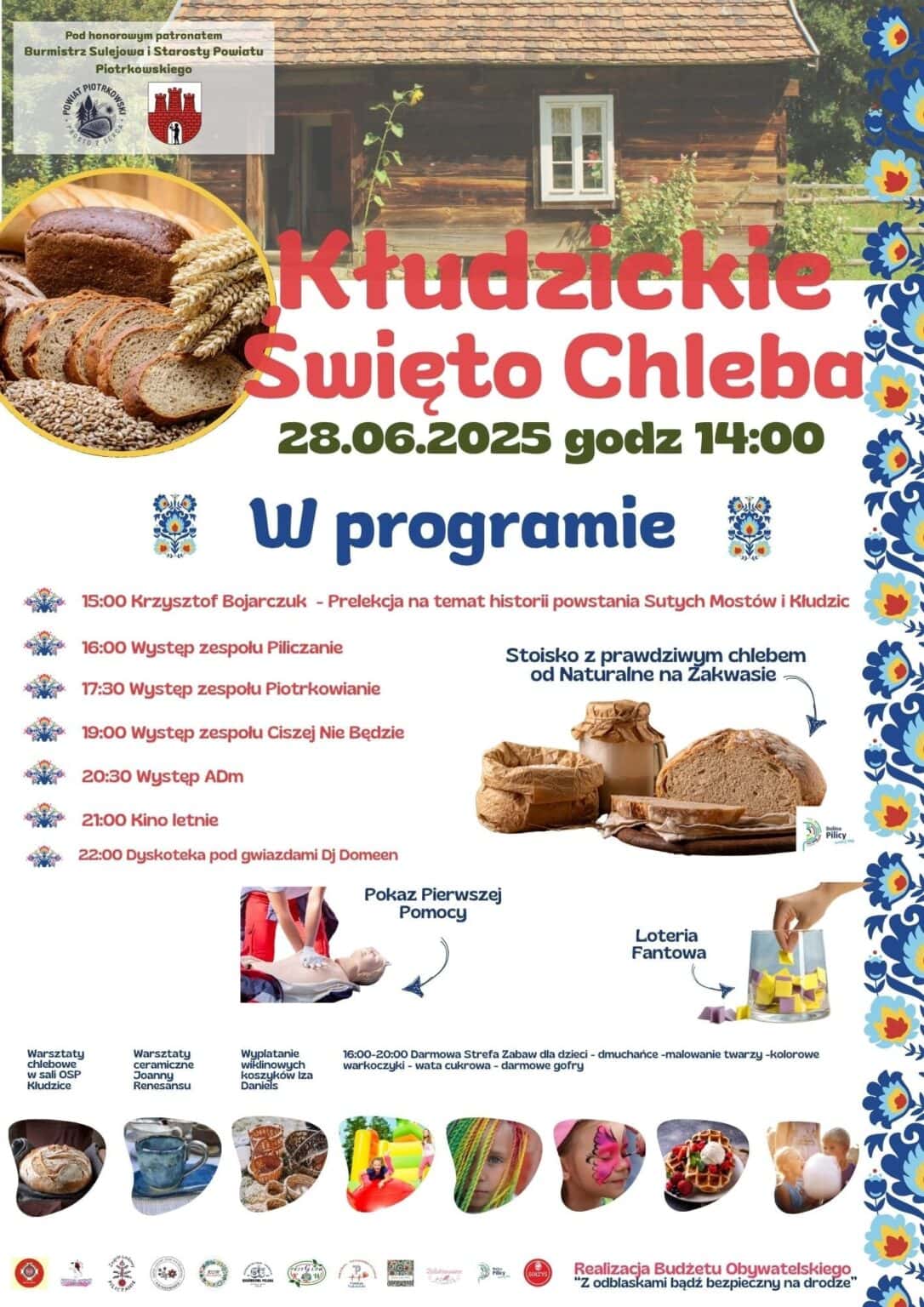 Już w najbliższą sobotę (28.06) od godz. 14:00 w Kłudzicach odbędzie się jedno z najbardziej aromatycznych i rodzinnych wydarzeń tego lata – Kłudzickie Święto Chleba. Wydarzenie organizowane jest pod honorowym patronatem Starosty Powiatu Piotrkowskiego Piotra Łącznego oraz Burmistrz Sulejowa Doroty Jankowskiej i realizowane w ramach Budżetu Obywatelskiego pod hasłem „Z odblaskami bądź bezpieczny na drodze”.