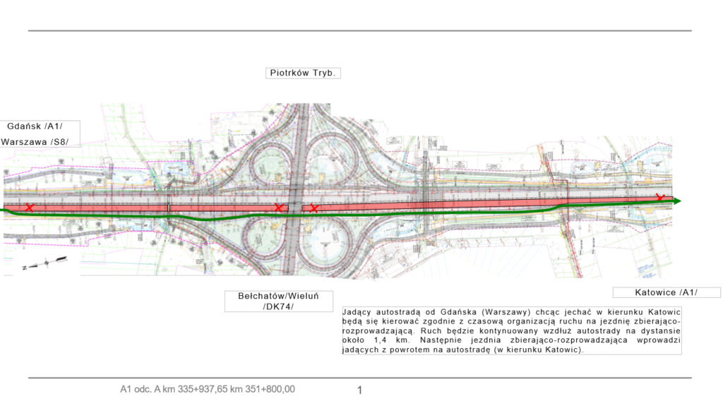 – Na jezdni zachodniej (przed węzłem Piotrków Trybunalski Zachód – jadąc od strony Łodzi) rozpoczyna się demontaż tzw. separatorów, czyli barier oddzielających pasy ruchu. Prace będą postępowały w kierunku południowym i jest to konieczny warunek do przeprowadzenia następnego etapu robót. Będzie to wymagało przeniesienia ruchu w kierunku Katowic na jezdnię rozprowadzającą (co ilustruje załączona grafika). Taka organizacja ruchu będzie obowiązywała do końca roku. – informuje Maciej Zalewski z łódzkiego oddziału GDDKiA.