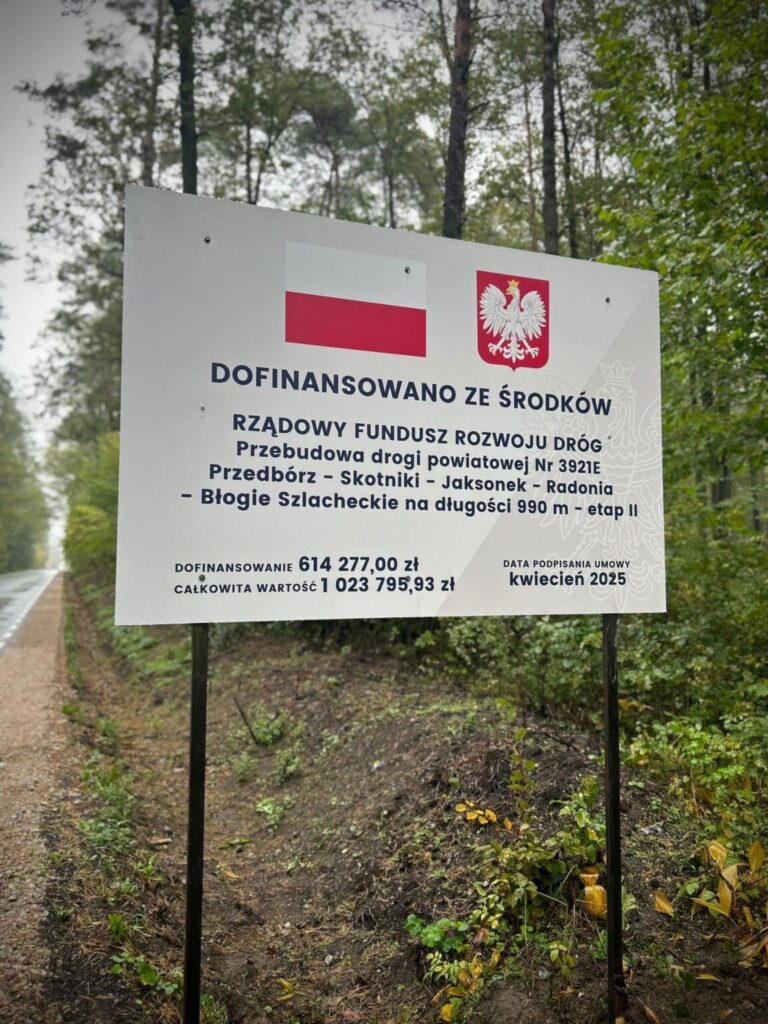 Druga inwestycja – przebudowa drogi powiatowej nr 3921E na odcinku Przedbórz – Skotniki – Jaksonek – Radonia – Błogie Szlacheckie – to zadanie wieloetapowe, realizowane z determinacją i planem: