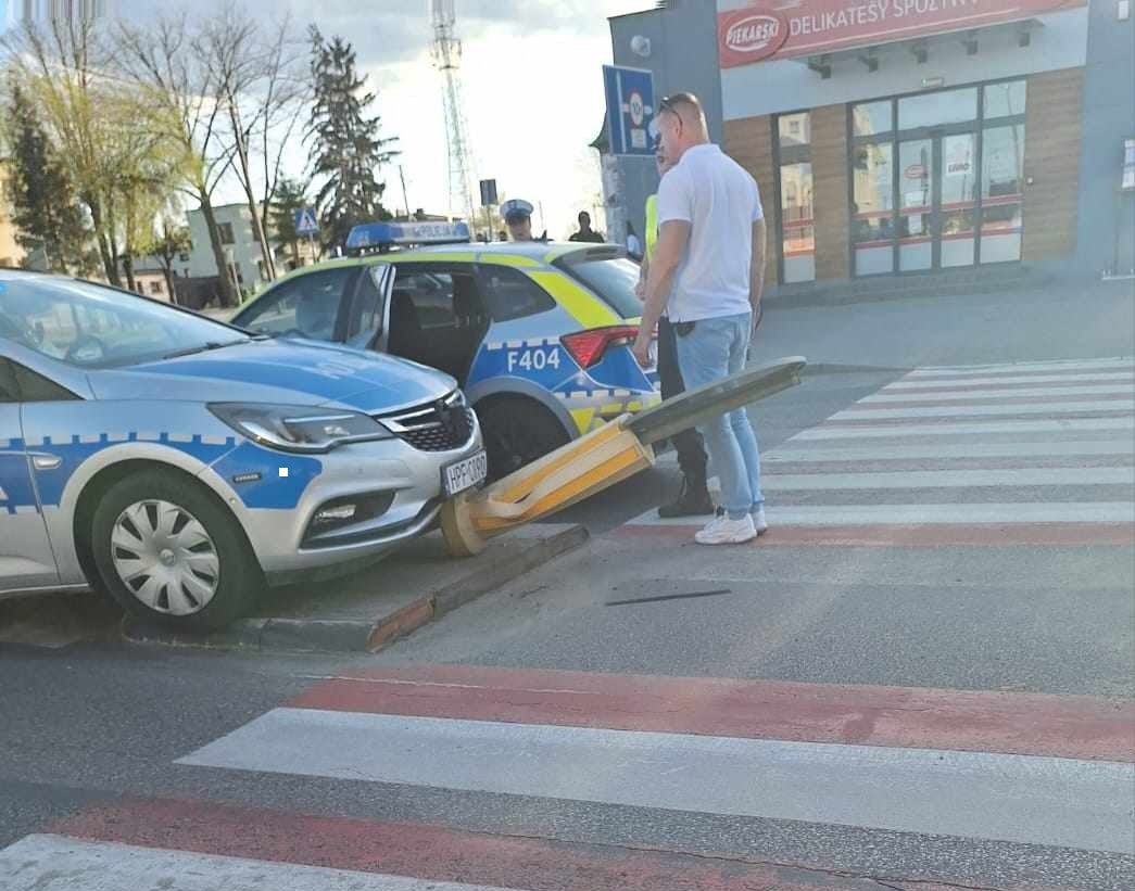 W Moszczenicy radiowóz uderzył w znak drogowy. Policyjny Opel ma uszkodzony przód.