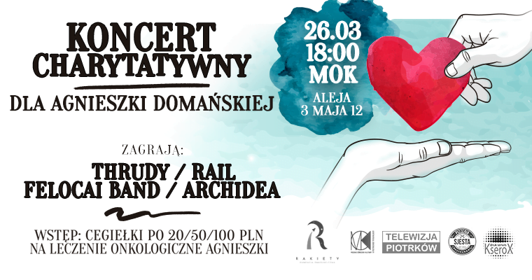 Zapraszamy na koncert wsparcia dla Agnieszki Domańskiej. W najbliższa sobotę 26 marca w KOK-u w Piotrkowie Trybunalskim zagrają dla Niej piotrkowskie formacje Rail, Felocai i Archidea oraz bełchatowska grupa Thrudy. Biletem wstępu na koncert będą cegiełki na rzecz dalszego leczenia onkologicznego i immunologicznego Agnieszki. Do wyboru po 20, 50 i 100 PLN. Cegiełka do cegiełki, ziarnko do ziarnka…