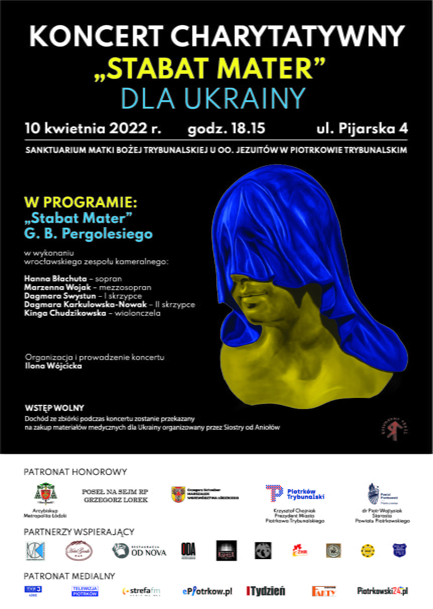 Serdecznie zapraszamy na Koncert charytatywny – „Stabat Mater” dla Ukrainy, który odbędzie się 10 kwietnia o godz. 18.15 w Sanktuarium Matki Bożej Trybunalskiej w kościele oo. Jezuitów w Piotrkowie Trybunalskim przy ul. Pijarskiej 4.