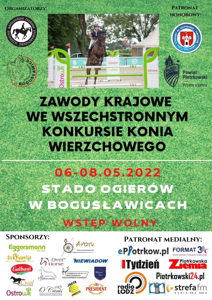 Zapraszamy do Stada Ogierów w Bogusławicach, na zawody regionalne we wszechstronnym konkursie konia wierzchowego. Zawody potrwają od dziś (06.05) do niedzieli (08.05). Organizatorami przedsięwzięcia są Stado Ogierów w Bogusławicach oraz Stowarzyszenie Napoleońska Zagroda.