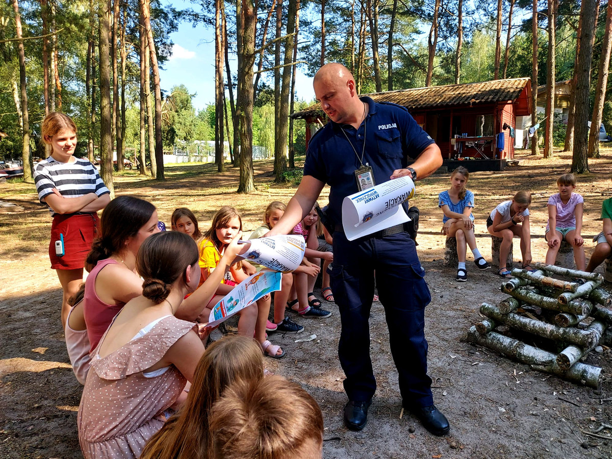 – Wspólne działania miały na celu kontrole obiektów, pod kątem odpowiednich warunków w jakich dzieci i młodzież spędzają wakacje. Mundurowi wraz z wizytatorem sprawdzali prawidłowość przebiegu obozu, kwalifikacje wychowawców oraz kierownika, liczebność grup zgodną z przepisami, a także programy realizowane podczas wypoczynku. Mundurowi w ramach działań „Kręci mnie bezpieczeństwo nad wodą” mieli też możliwość porozmawiania z młodzieżą o zasadach bezpieczeństwa podczas wypoczynku przy akwenach oraz w lesie. Policjanci porozmawiali z najmłodszymi jak wezwać pomoc i co należy zrobić kiedy zgubią się w lesie. Przypomnieli też o podstawowych zasadach bezpieczeństwa podczas kąpieli w zbiornikach wodnych, a także podczas korzystania ze sprzętu wodnego. Poruszony został również temat, co należy zrobić w przypadku zgubienia się, np. na plaży.