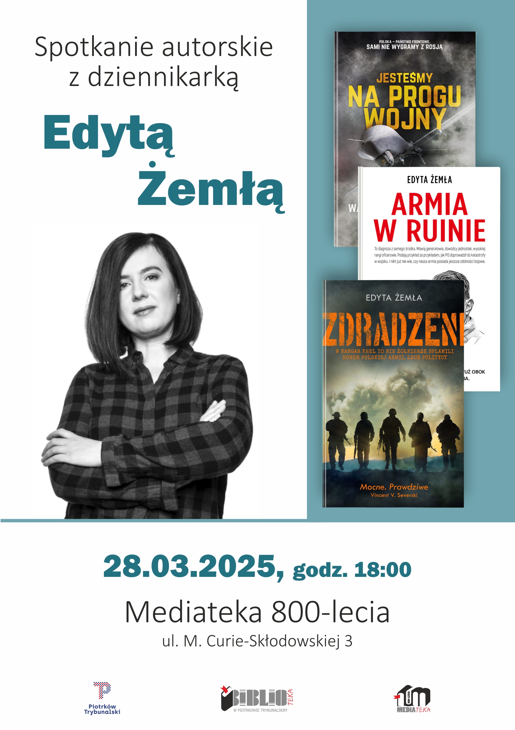 Zapraszamy na spotkanie z Edytą Żemłą, dziennikarką Onetu, specjalistką w tematyce wojskowej, korespondentką wojenną i autorką książek reporterskich. Wydarzenie odbędzie się 28 marca 2025 roku o godzinie 18:00 w Mediatece 800-lecia.