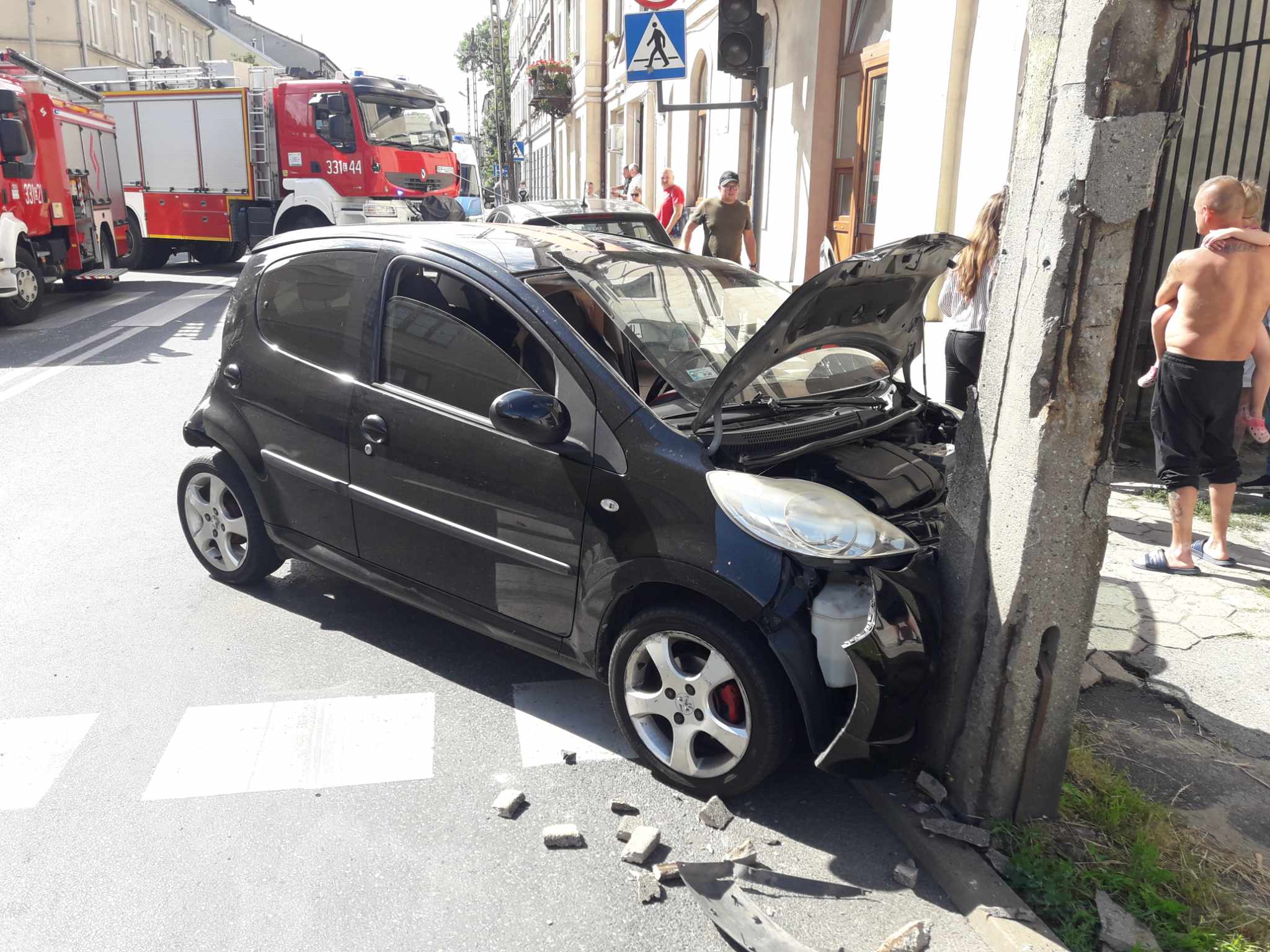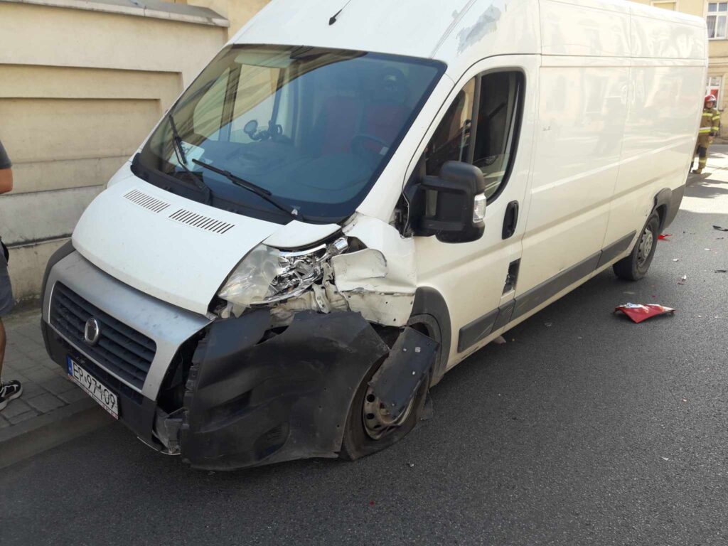 Wygląda groźnie, ale na szczęście nie ma ofiar w ludziach. Z naszych nieoficjalnych informacji wynika, że kierująca citroenem, jechała od strony ulicy Toruńskiej i zatrzymała się by wjechać w bramę po lewej stronie jezdni. Kierujący busem zagapił się i uderzył w tył osobówki. Siła uderzenia była na tyle duża, że citroen wpadł na słup, lekko zawadzając seata.