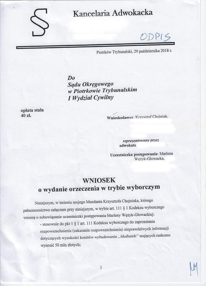 Nim w najbliższą niedzielę o ich losie w drugiej turze głosowania zdecydują mieszkańcy Piotrkowa, to wcześniej o losie Marleny Wężyk-Głowackiej zdecyduje Sąd. Urzędujący prezydent miasta Krzysztof Chojniak pozwał bowiem w trybie wyborczym swoją kontrkandydatkę. Pismo trafiło do Sądu Okręgowego w poniedziałek.