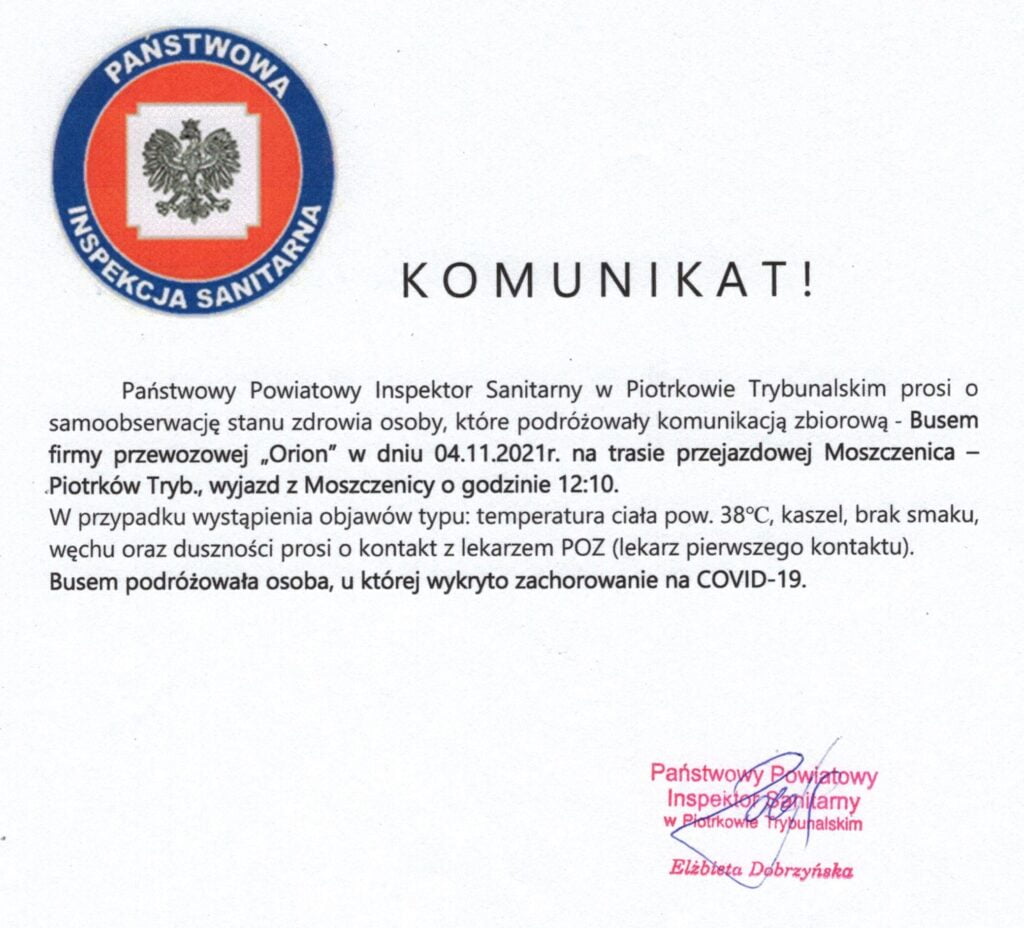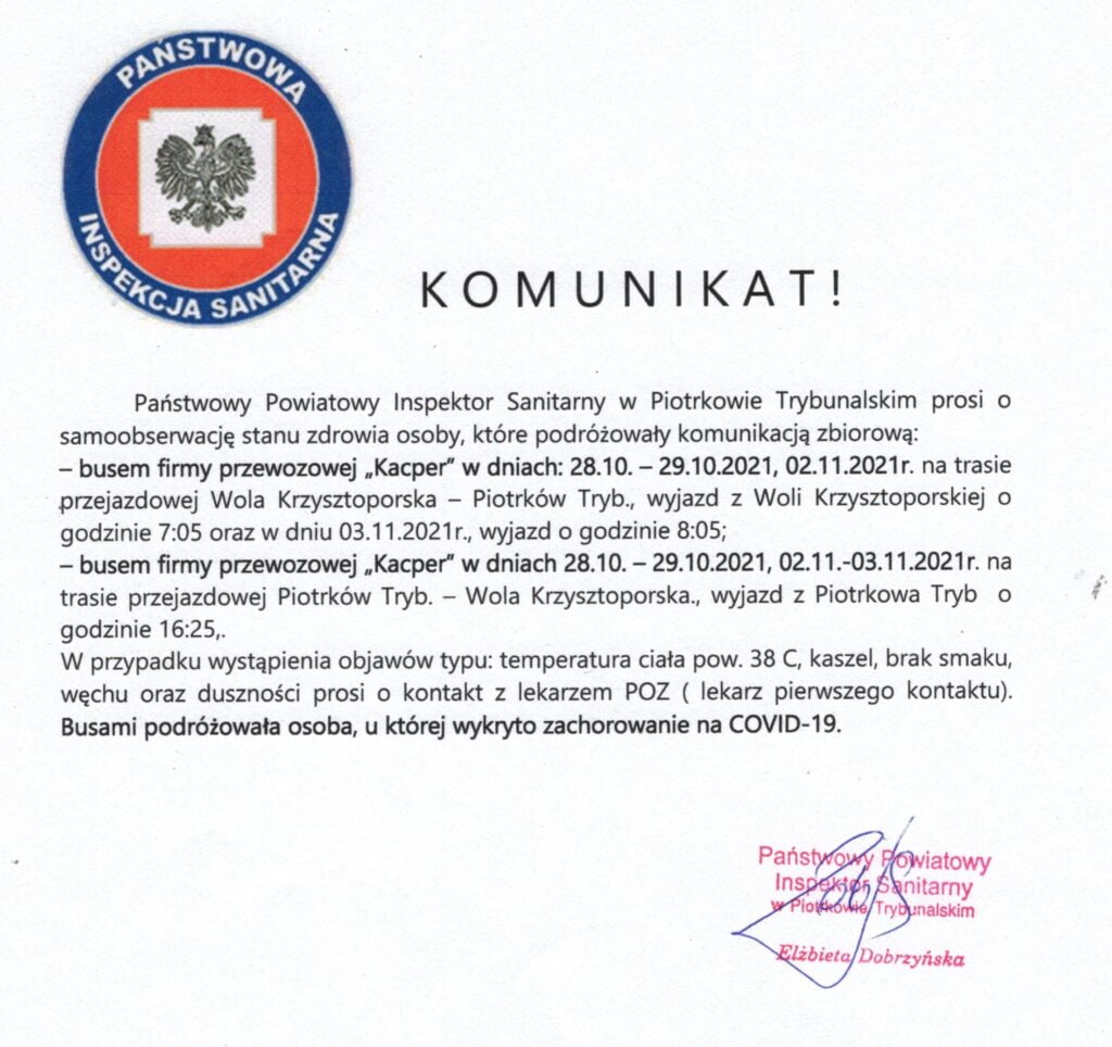 Piotrkowski sanepid wydał kolejny komunikat dla osób które podróżowały komunikacją zbiorową. Tym razem chodzi o pasażerów jadących „do” lub „z” Woli Krzysztoporskiej i Moszczenicy. Sanepid zaleca obserwowanie swojego stanu zdrowia, a w razie potrzeby, o kontakt z lekarzem.