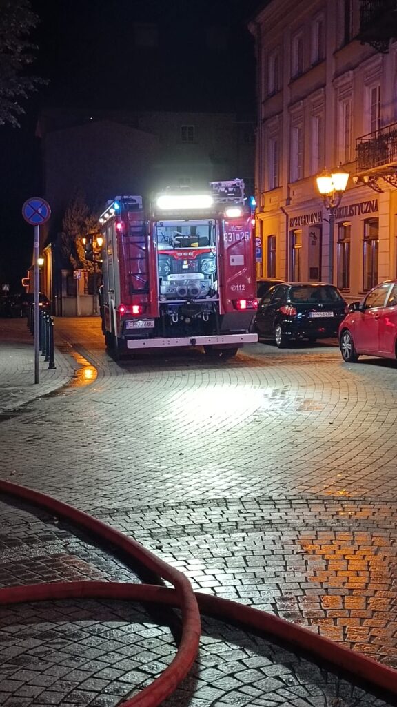 Niestety, podczas akcji jeden z funkcjonariuszy Państwowej Straży Pożarnej, w trakcie działań wewnątrz silnie zadymionego budynku, poślizgnął się i osunął ze schodów. Poszkodowany strażak został przewieziony do szpitala na szczegółowe badania.