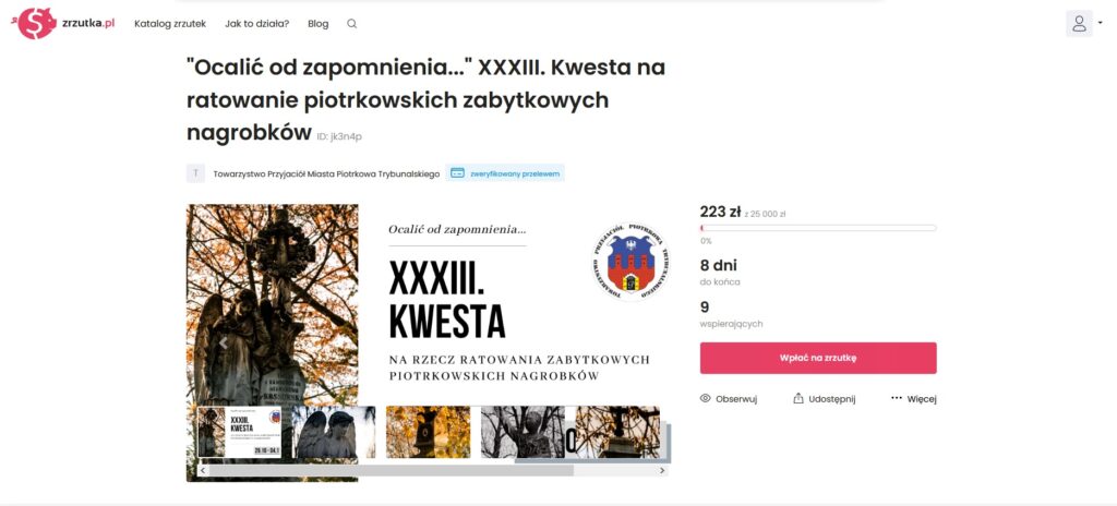 – W dobie pandemii, kiedy wszystko zaczyna odbywać się zdalnie my również postanowiliśmy wpisać się w ten „trend” i będziemy kwestować w internecie. Już wkrótce znajdziecie nas państwo na portalu do organizowania zbiórek społecznościowych (www.zrzutka.pl) oraz oczywiście na Facebooku pod hasłem Ocalić od zapomnienia… XXXIII Kwesta na ratowanie piotrkowskich zabytkowych nagrobków – informuje Waldemar Domarańczyk, prezes TPPT. – Kwestę będzie można wesprzeć finansowo drogą elektroniczną za pomocą wspomnianego portalu, lub tradycyjnym przelewem na konto Towarzystwa Przyjaciół Piotrkowa Trybunalskiego- dodał prezes.